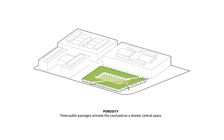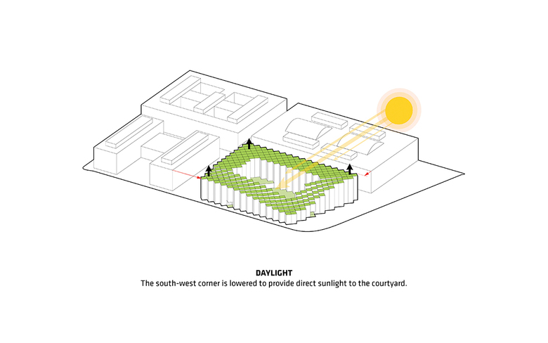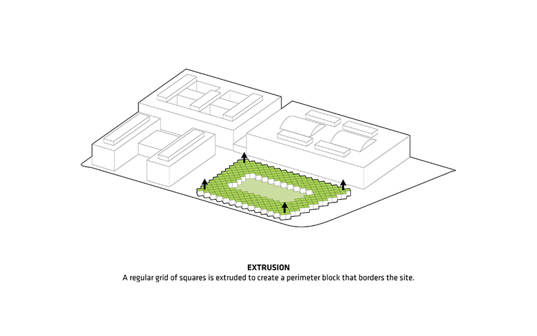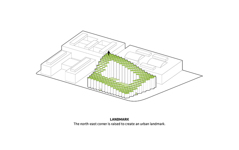 Located on the edge of Gärdet, a treasured national park, Kullen makes conscious decisions to provide a sensitive, respectful form while allowing the same choices to simultaneously manifest as exceptional residences with spectacular views. In direct response to the context, the northwest and southeast corners take the heights of their immediate neighbors; while the northeast corner, farthest from the park and nominally with the worst view, is pulled upwards to grant it the most spectacular views of park and port. The southwest point of the building extends farthest into Gärdet; and to create a humane edge between building and nature, is pushed down to the lowest profile, transforming it into a public platform with a 270 degree view of parkscape and simultaneously freeing the majority of the residential units to views of the park. The same move also ensures that the central courtyard will always receive copious amounts of sunlight. In further deference to Gärdet, the massing is visually reduced through a language of pixels, scaled to the human form. This manipulation not only allows for a more organic expression, perfectly reflecting the surrounding landscape, but also provides a way to accomplish the building topography in a controlled and inexpensive way through the use of prefabricated units of standardized sizes.