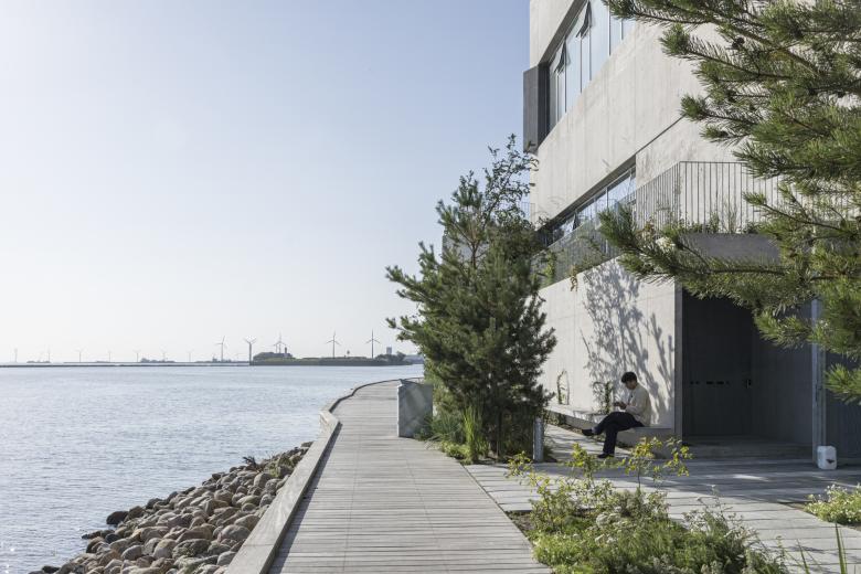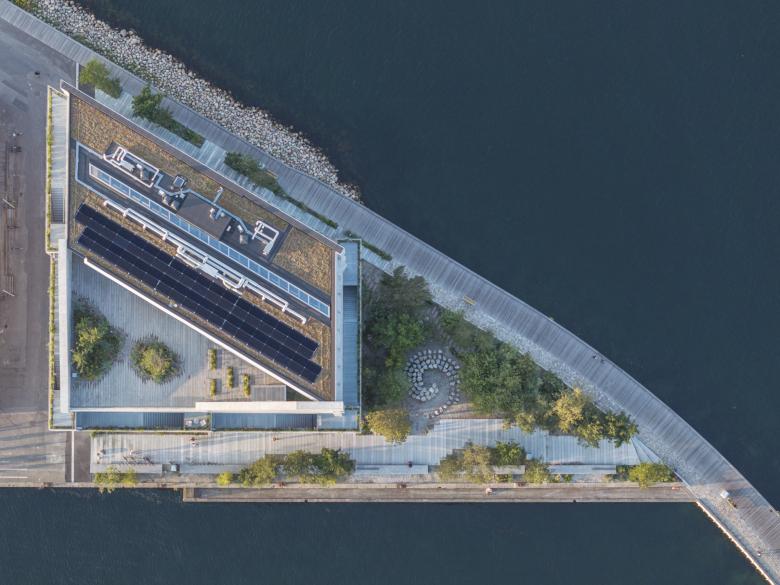 At the foot of the building, BIG Landscape has transformed a former parking area into a 1,500 m2 public park, inspired by the sandy beaches and coastal forests of the Danish landscape. Towards the north, native forest trees, such as pines and oaks, protect against the harsh winds of the harbor. Towards the south, areas with planting, rocks and woods are created to support habitat creation for biodiversity as well as a soft surface for play and relaxation.
