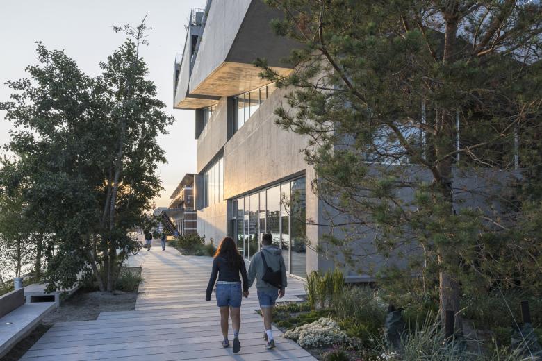 Along the outside staircase wrapping around the HQ, wind-tolerant species of trees, shrubs, perennials, and herbs are planted, with the herbs used by chefs in the studio’s canteen. The rooftop terrace, paved with wood from a local sawmill, continues the park’s theme of natural materials to create a holistic connection between urban space and architecture, while offering employees and guests a unique view of the city and the water.
