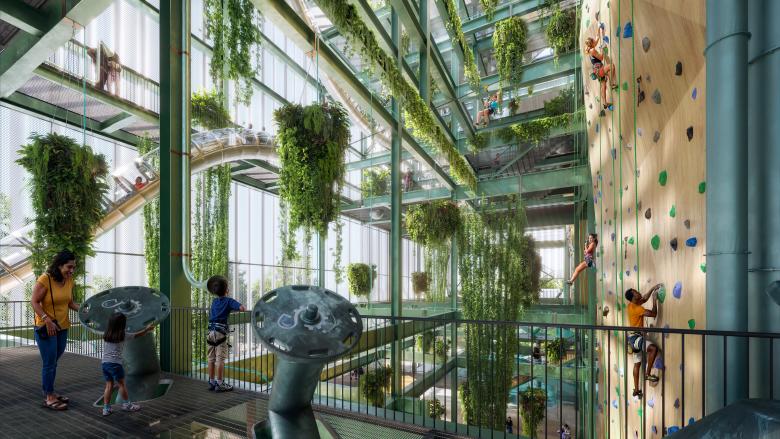 The eight-story boiler building will focus on recreation, including multiple play areas and food and beverage options. The turbine hall will be converted into a multi-purpose event space and speakeasy, while the adjacent office building will provide opportunities for marine and ecological learning as a laboratory with classrooms and research spaces. The design will preserve key aspects of the existing power plant, including the structural framework, smokestack, and administrative space.