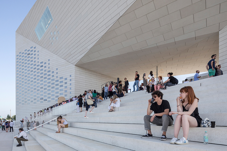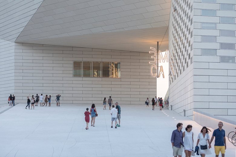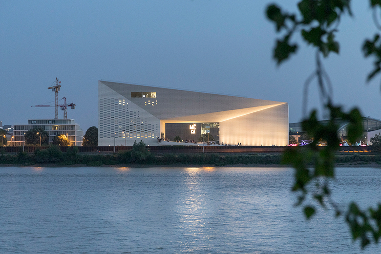 The building is conceived as a single loop of cultural institutions and public space by extruding the pavement of the promenade to become the ramp that leads into the urban living room, the façade with glimpses into the stage towers of OARA and the offices of ALCA, and the rooftop enclosing the sky-lit galleries of FRAC. A series of steps and ramps lead the public directly into the 1,100 m2 outdoor urban room at the core of MÉCA, creating a porous institution for visitors to roam freely between the Quai de Paludate street to the river promenade. A 7m high MÉCA sign illuminates the space with white LED lights, like a modern chandelier at the scale of the urban room. During special occasions, MÉCA’s outdoor spaces can be transformed into a stage for concerts and theatrical spectacles or an extended gallery for sculptures and other art installations. A permanent bronze sculpture depicting a half-head of Hermes by French artist Benoît Maire intersects with the entrance on the riverside, inviting visitors to reflect on the contemporary culture of the region.