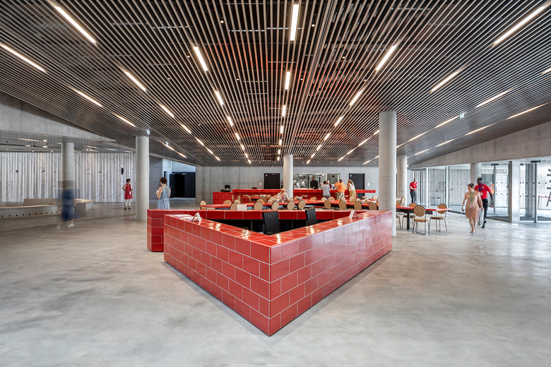 Upon entering MÉCA from the ground floor, visitors arrive at the lobby where they can relax in the spiral pit or dine at the restaurant Le CREM, furnished with red furniture and cork chairs designed by BIG in reference to the city known for wine. A giant periscope by the restaurant and elevators allows visitors to see the activity in the outdoor urban room and vise-versa, creating an indoor-outdoor dialogue. On the same ground floor, those with tickets can enjoy performances in OARA’s 250-seat theatre featuring flexible seating configurations and acoustic systems optimized by an all-black checkerboard panel of concrete, wood and perforated metal. Upstairs, filmgoers can view screenings at ALCA’s red-accented 80-seat cinema or visit the two production offices and project incubation area.