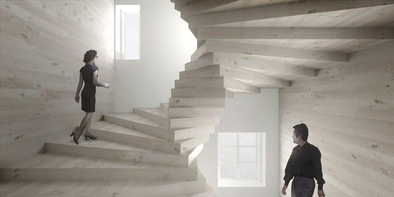 The roof and ceiling of the pavilion is conceived as a single sheet of metal – a steel structure clad in brass, continuous in plan but undulating in section to create a series of openings allowing daylight and views to the exhibits. Towards the end of the visit the double spiral intersects the existing museum building providing access to the vaulted spaces in the lower floor and to the attic. The dynamic forms of modern materials, concrete and brass, give way for a locally anchored tectonic of straight lines and warm surfaces of wood or stone. Heavy meets light. Soft meets hard. Warm meets cool.
