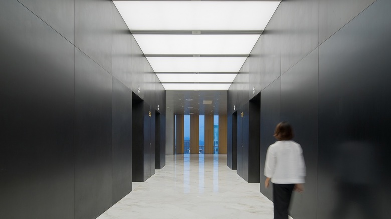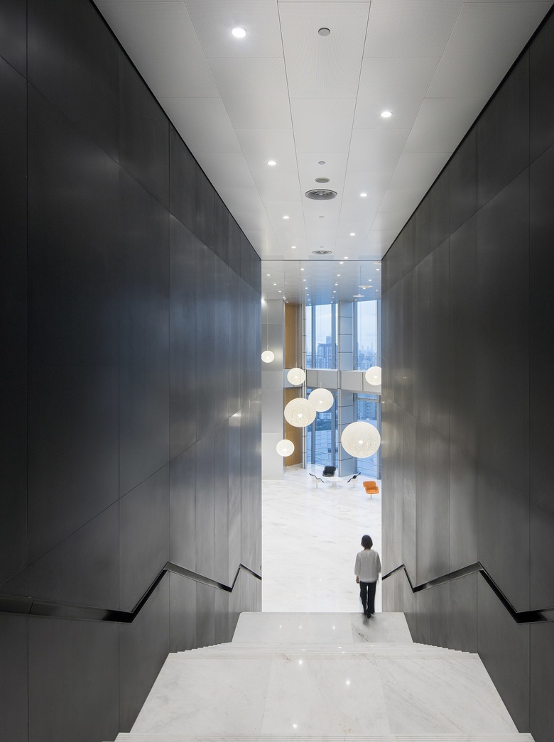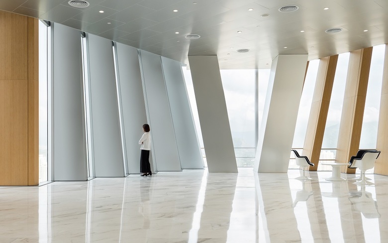 As the sun sets, the changing transparency and the curved lines of the façade create an almost wood-like texture or a scene of vertical terraced hills. The slits that open between the curtain wall to reveal special spaces such as boardrooms, executive offices and beakout areas, lend the building a distinct character from different parts of the city.