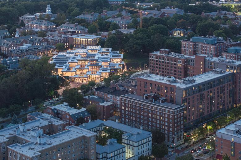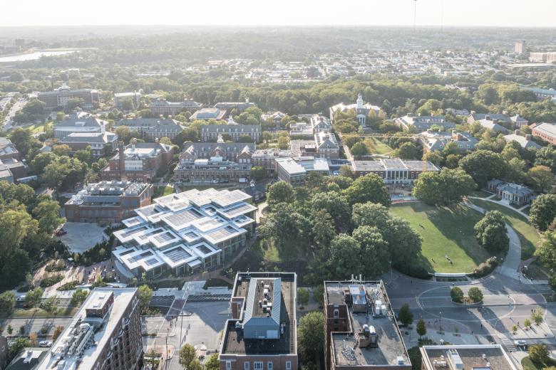Located at 33rd Street and Charles Street, at the nexus of the Homewood campus and the surrounding neighborhood, the building was conceived as a series of cascading, mass timber-framed volumes with flat, cantilevered roofs topped with nearly 1,000 photovoltaic panels, which generate approximately half of the building’s electricity. The resulting “village” of 29 pavilions is carved into its 30-foot sloped site, allowing direct entry on all four levels, enhancing accessibility while maintaining a human scale. Exposed wood columns and ceilings are connected by an expansive glazed façade that floods the interior with daylight from all sides and offers passersby views into the ever-changing mosaic of student life within.