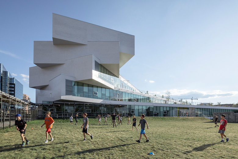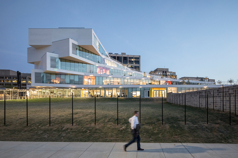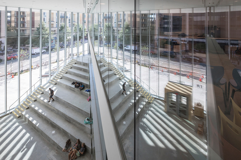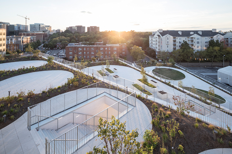 The Heights Building opens as a cascade of green terraces fanning from a central axis, addressing the academic needs of Arlington’s two county-wide school programs while forming a vertical community within its dense urban context. Located along Arlington’s Rosslyn-Ballston corridor, The Heights merges two existing secondary schools – the H-B Woodlawn Program and the Eunice Kennedy Shriver Program – into a new 180,000sf building to accommodate an expected enrollment of up to 775 students. Working closely with Arlington Public Schools (APS), WRAP (West Rosslyn Area Plan) and the Arlington community, the design supports both H-B Woodlawn’s visual and performing arts-focused curricula and Shriver’s extensive resources for students with specialized educational needs. The Heights is currently on track to achieve LEED Gold.