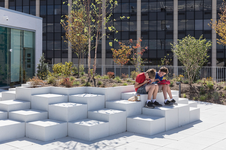 Situated within a compact urban site bounded by roads on three sides and a portion of Rosslyn Highlands Park, The Heights is conceived as a stack of five rectangular floorplates that rotate around a fixed pivot point, maintaining the community feeling and spatial efficiencies of a one-story school. Green terraces above each floor become an extension of the classroom, creating an indoor-outdoor learning landscape for both students and teachers — an educational oasis rather than a traditional school setting. A rotating central staircase cuts through the interior of the building to connect the four-tiered terraces, allowing students to circulate outside and forge a stronger bond between the neighborhood and the school. While the upper terraces are more suitable for intimate classes and quiet study areas, the spacious first terrace and 18,700sf recreation field also serve as public event venues for school-wide and neighborhood activities.