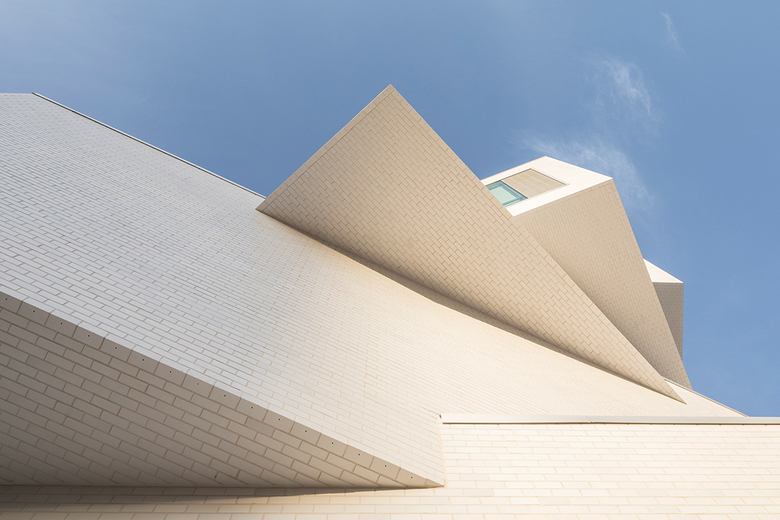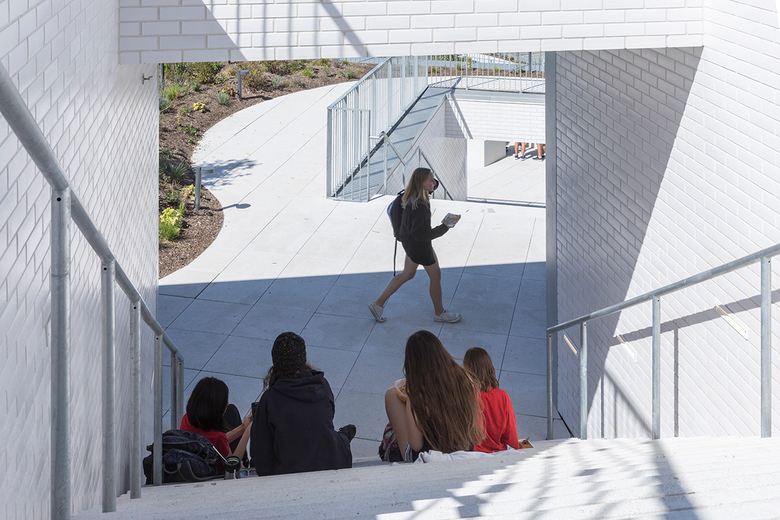 The classroom bars serve as the primary organizing elements, surrounding a central vertical core that contains the elevators, stairs and bathrooms. As students enter from the central staircase, they are greeted by an expanded gradient of the color spectrum: each classroom bar is defined by its own color, combining intuitive wayfinding with a vibrant social atmosphere from the ground to the sky. The Shriver Program providing special education for students aged 11 to 22 occupy two floors of the building accessible from the ground floor, and have specialized spaces dedicated to support APS’ Functional Life Skills program as well as privacy and ease of accessibility: the gymnasium, courtyard, occupational physical therapy suite and sensory cottage are designed to aid in sensory processing. The Heights’ exterior is materialized in a graceful white glazed brick to unify the five volumes and highlight the oblique angles of the fanning classroom bars, allowing the sculptural form, the energy and the activity of the inside to take center stage. In keeping the surrounding neighborhood and former Wilson School in mind, the building’s material palette pays homage to the historical architecture of Old Town Alexandria.