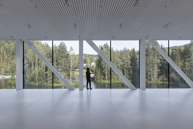 A simple twist in the building’s volume allows the bridge to lift from the lower, forested riverbank in the south up to the hillside area in the north. As a continuous path in the landscape, both sides of the building serve as the main entrance. From the south entry, visitors cross a 16m aluminum-clad steel bridge to reach the double-height space with a clear view to the north end, similarly linked with a 9m pedestrian bridge. The double-curve geometry of the museum is comprised of straight 40cm wide aluminum panels arranged like a stack of books, shifted ever so slightly in a fanning motion. The same principle is used inside with white painted 8cm wide fir slats cladding the floor, wall and ceiling as one uniform backdrop for Kistefos’ short-term Norwegian and international exhibitions. From either direction, visitors experience the twisted gallery as though walking through a camera shutter.