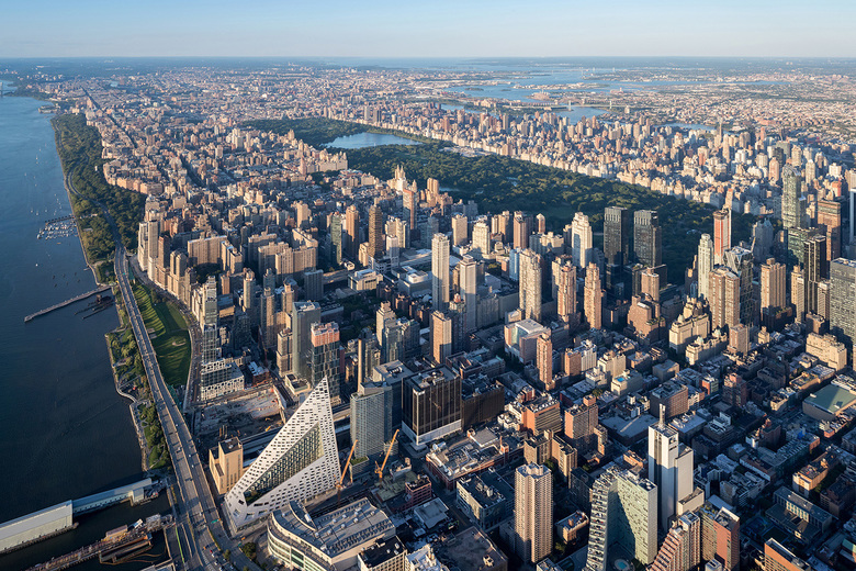 VIA 57 West is a hybrid between the European perimeter block and a traditional Manhattan high-rise, combining the advantages of both: the compactness and efficiency of a courtyard building with the airiness and the expansive views of a skyscraper. By keeping three corners of the block low and lifting the north-east corner up towards its 450 ft peak, the courtyard opens views towards the Hudson River, bringing low western sun deep into the block and graciously preserving the adjacent Helena Tower's views of the river. The form of the building shifts depending on the viewer's vantage point. While appearing like a pyramid from the West-Side-Highway, it turns into a dramatic glass spire from West 58th Street. The courtyard which is inspired by the classic Copenhagen urban oasis can be seen from the street and serves to extend the adjacent greenery of the Hudson River Park into VIA. The slope of the building allows for a transition in scale between the low-rise structures to the south and the high-rise residential towers to the north and west of the site. The highly visible sloping roof consists of a simple ruled surface perforated by terraces - each one unique and south-facing. The fishbone pattern of the walls are also reflected in its elevations. Every apartment gets a bay window to amplify the benefits of the generous view and balconies which encourage interaction between residents and passers-by.