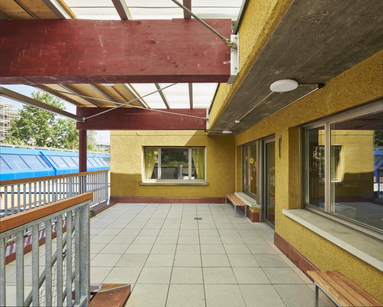 Die Primarschule Manegg im Zürcher Quartier Wollishofen verzeichnet einen gestiegenen Bedarf an Kindergartenräumlichkeiten. Da die Anlage aus den 1930er Jahren keine Erweiterung zulässt, entschied man sich, die sanierungsbedürftigen Mietwohnungen im Obergeschoss des stadteigenen Werkhofs an der Mööslistrasse zu einem Kindergarten mit Betreuung und Mittagstisch umzunutzen. Dabei wurden die Innenwände der kleinkammerigen Wohnungen rückgebaut und mit Hilfe von Stahlträgern grössere Räume gebildet, um sie als Kindergartenzimmer, Aufenthaltsraum, Gruppenraum und Garderobe nutzen zu können. Das Umbauprojekt gilt als Pionierprojekt für Kreislaufwirtschaft, in der Absicht und im Sinne des städtischen Netto-Null-Ziels, die Treibhausgasemissionen zu reduzieren. Dazu trug der Einsatz von möglichst vielen Re-Use Bauteilen und der Erhalt von Vorhandenem aus den ehemaligen Wohnräumen bei. Als wiederverwendete Bauteile wurden die Vordachkonstruktion, die Aussentreppe, Geländer, Pflanztröge, die Stahlkonstruktion zur Beschattung der Aussenräume, diverse Stahlträger, Holzstützen, Brandschutztüren, Akustikelemente, Sanitärapparate und eine gebrauchte Küche wieder eingebaut. Durch ein kräftiges Farbkonzept werden die unterschiedlichen wiederverwendeten Materialien im Innenraum visuell zu einer Einheit zusammengehalten. Im Vergleich zu einem konventionellen Umbau, mit ausschliesslich neuem Material, konnte beim Pilotprojekt mit Re-Use Bauteilen eine rund 30% Einsparung der grauen Emissionen (CO2e/m2a) nachgewiesen werden.