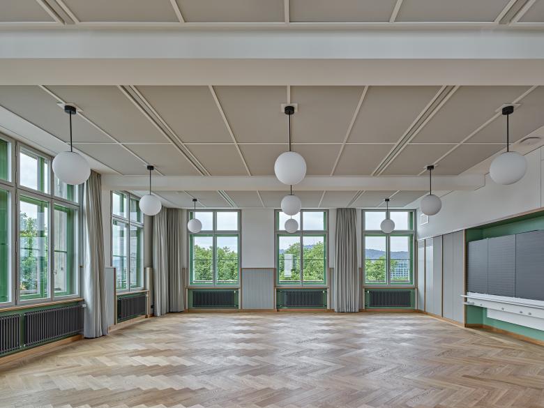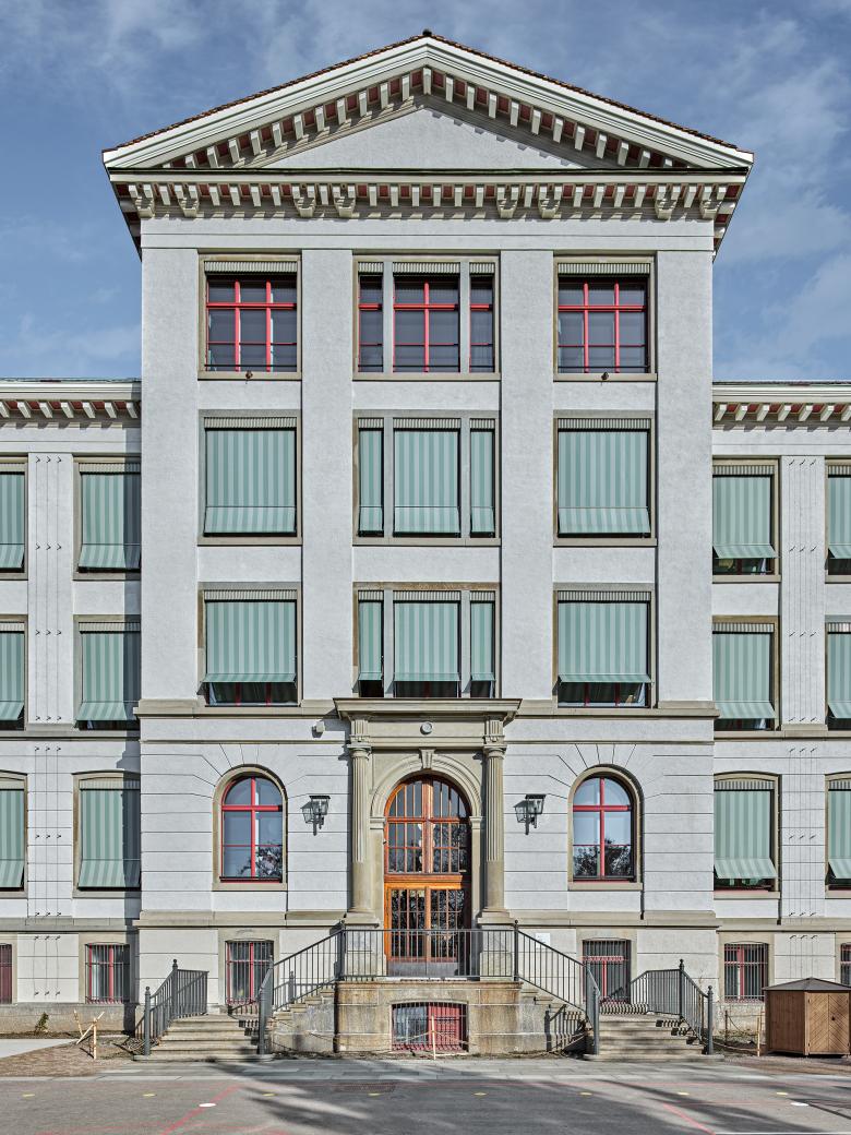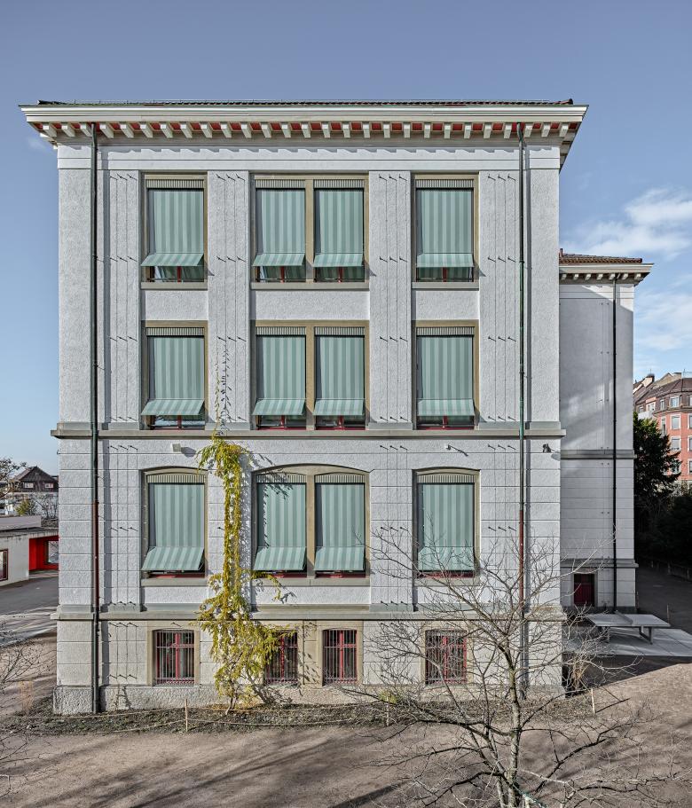 Das 1892 erbaute Schulgebäude an der Rosengartenstrasse ist im kommunalen Inventar der Denkmalpflege eingetragen und zeichnet sich durch grosse räumliche Qualitäten aus. Es repräsentiert den Typus des „Normalschulhauses“ aus der Zeit ab 1835 und besitzt die grössten und vermutlich am meisten lichtdurchfluteten Klassenzimmer der Stadt Zürich. Die Gesamtinstandsetzung beinhaltet eine Erdbebenertüchtigung, die Erneuerung der Gebäudehülle, die Sanierung der Klassenzimmer, Korridore und Garderoben, den Ausbau des Dachstocks mit neuem Lehrerbereich und Bibliothek, den Einbau eines Liftes, eines Mehrzweck- und Veranstaltungsraumes sowie Umnutzungen von Teilen des Untergeschosses. Um den Schallschutz an der hochfrequentierten Strasse zu verbessern, wurden neue Kastenfenster eingebaut mit Bezug auf die bauzeitlichen Doppelfenster. Die Gestaltungsidee des neuen Teambereichs im Dachstock sieht einen zentralen Mittelraum für Sitzungen und Pausen mit einem grossen Dachfenster mit Ausblick auf den benachbarten Kirchturm vor, welcher über transluzente, als Bücherregale konzipierte Trennwände zwei angrenzende, intimere Arbeitsräume mit Teeküche belichtet. Der Dachraum bleibt so trotz Unterteilung als Ganzes erlebbar. Im Rahmen der energetischen Verbesserung der Gebäudehülle wurde lediglich im Bereich des Wandtäfers bis auf mittlerer Raumhöhe eine innenseitige Wärmedämmung eingebaut. Diese Massnahme erhält die Speichermasse der Aussenwand und schafft eine Balance zwischen sommerlichem Wärmeschutz und angenehmer Behaglichkeit in der kalten Jahreszeit. Eine neue Lüftungszentrale in der Dachwinde versorgt das Gebäude mit Frischluft. Die Umgebungsgestaltung umfasst die Entsiegelung eines Grossteils der Fläche. Kletterrosen und verschiedene Rebsorten bewachsen die Fassade vertikal und tragen zu einem kühlen Mikroklima bei.