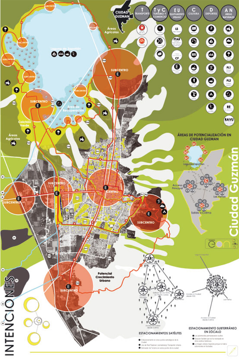 Guzman is located alongside the highway that leads to Manzanillo, a premier beach destination for people living in Guadalajara. The first problem we identified was that it was not a destination in itself, people only stopped in Guzman if they needed gas or supplies. The next major problem was that being known as an educational hub in the region (it is home to ten important universities), it offered no employment for graduating students, so they fled to seek work elsewhere.Guzman has a huge potential to become a destination city because of its many attractions: its undeveloped and almost virgin-like lake, the historic center with its cathedral and many churches, the ten universities and the conglomerate cliffs of the nearby mountains. We identified these specific areas as quiescent spheres waiting to be roused to interact with each other, like atoms in a dormant state before a chain reaction transforms them into energy. This is the concept behind the master plan: to take advantage of the intervention of the Pan-American Games to trigger the potential and the interaction of different areas of the city. The lake has a strong sports vocation but the cultural and environmental potential can’t be ignored. That’s why a series of diverse focal interventions were planned to take advantage of these aspects: a school for the arts, a gastronomical center, housing units, a hotel, a cultural center.The master plan was intended to regenerate a dried-up river and a forgotten canal that cross through the city and turn them into linear parks that promote diverse sporting and cultural activities. Guzman lacks a proper entrance from the highway so it is very easy to miss. This was a crucial problem to be solved with a striking landscape intervention.We proposed to gradually discourage car use by pedestrianizing most of the city center streets and restricting cars in others, rerouting the principal avenues to avoid the center and creating a bicycle rental program to encourage their use.Another major problem to attend to was the limited number of hours people spent in the center due to monopolization by commercial use. In order to combat this we encouraged a mixed and varied use through the reincorporation of residential, office, restaurant and bar use.