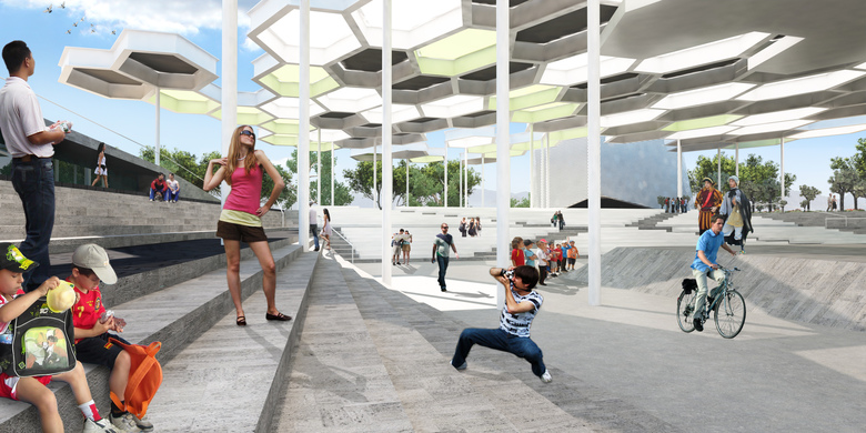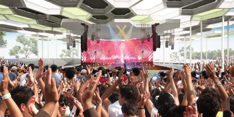 We set out to find this new configuration of the performance space. We extended a single flat roof comprised of hexagonal modules over the entire site. The roof is a single datum that does not acknowledge any one point below it as its focus. Below it we erect the traditional stepped surface of an amphitheater to allow visibility of the stage but these steps are collapsible to turn a traditional amphitheater into a free topography of gentle inclines. The fixed theatre is no longer present, as performance spaces are created and eliminated as needed in a more active appropriation of the theater.