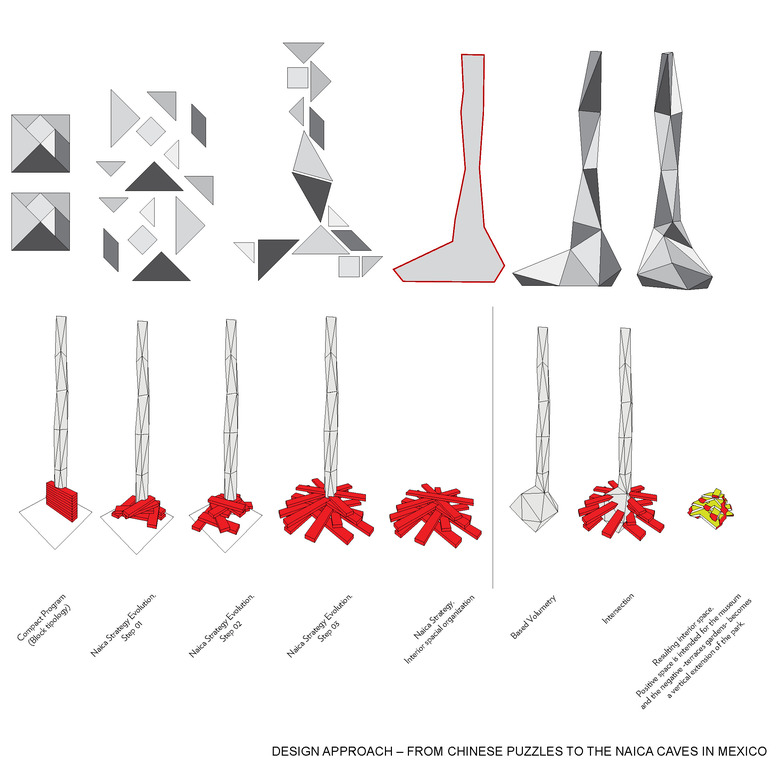The form, structure, materiality and functionality of the tower are a direct result of an evolution process that amalgamates our basic concepts: the abstraction of the TANGRAM puzzle as a representative element of the Chinese culture and the Naica Cave in Mexico as a unique manifestation in the world. This cultural cross breading gives our tower an unexampled, distinctive and particular character.