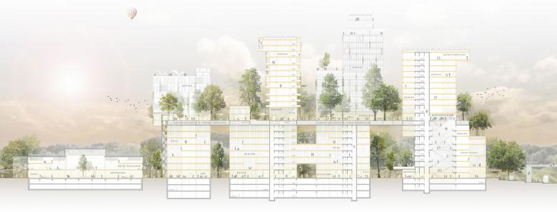Die gestapelte Stadt zeichnet sich in erster Linie durch die sozialräumliche Schichtung und erst in zweiter durch die gestalterische Stapelung aus. Neben der baulichen Dichte braucht es auch eine Nutzungs- und landschaftliche Dichte. Ein einheitliches baufeldübergreifendes Raster und eine klare Schnitt-Lösung bilden die robuste und resiliente Grundstruktur, die viel Freiraum für zukünftige Entwicklungen und Veränderungen bietet. Die Stadtterrasse auf 30 Metern ist eines der zentralen Elemente der gestapelten Stadt und übernimmt eine Vielzahl an Funktionen. Neben statischen und raumhaltigen Funktionen verbindet sie die Gebäue miteinander und ermöglicht als gemeinschaftlicher Aussenraum «bodennahes» Wohnen im Grünen. Als Baustein der Schwammstadt ist sie über vertikal begrünte Fassaden und Treppenhäuser mit der gewerblichen Stadtebene unterhalb der Terrasse verknüpft. Die Holz-Hybridbauweise mit konsequenter Systemtrennung, kreislauffähigen Materialien mit tiefem Grau-Energiewert sowie der Fokus auf passiven energetischen Massnahmen, erfüllen hohe ökologische Ansprüche.
