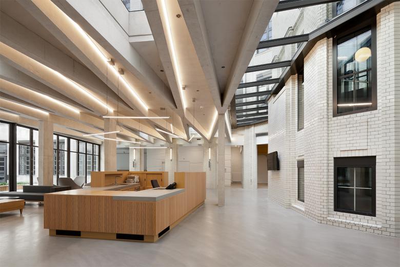 In the course of restructuring the Barmer GEK, BFA has made it’s Berlin administration building fit for the future. The listed building from 1907 has been freshly designed to have an open structure across all floors. A newly built, bright pavilion in the inner courtyard prevails as the central reception area, while also connecting the surrounding parts of the building and asserting itself as the visitor-friendly pillar of the ensemble. The ground floor is converted into a multi-use, versatile space, whereas the first floor is transformed with it’s modern conference and training rooms to a welcomed meeting point for employees. The structural opening across all floors allows an unobstructed view throughout the building. Thus translating the theme of transparency into architecture.