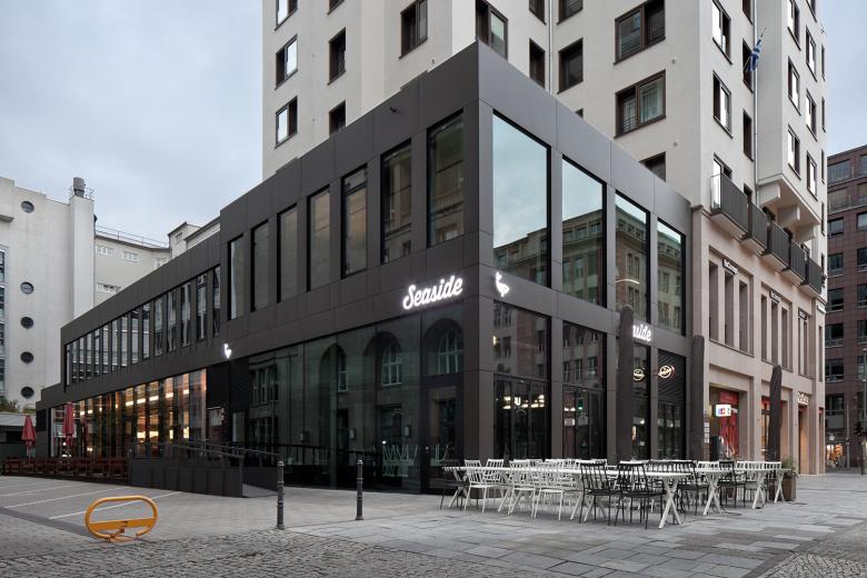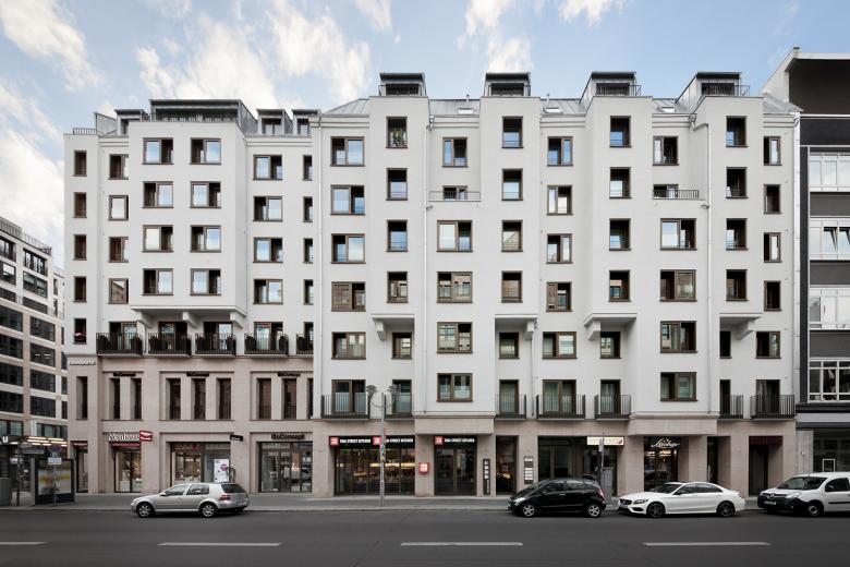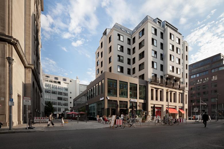 The corner Friedrichstrasse/ Mohrenstrasse presents a new face. In the course of the energetically redevelopment, the facade of the office- and residential building was completely renewed, including high quality wooden windows and a new roof cladding. New retail spaces replace the former arcades. The complex was extended by a new building accomodating a Restaurant. The old and the new are internally connected and the facade opens up to the Mohrenstrasse , offering the restaurant guests an open view through large scale windows.