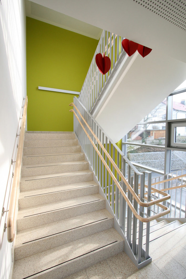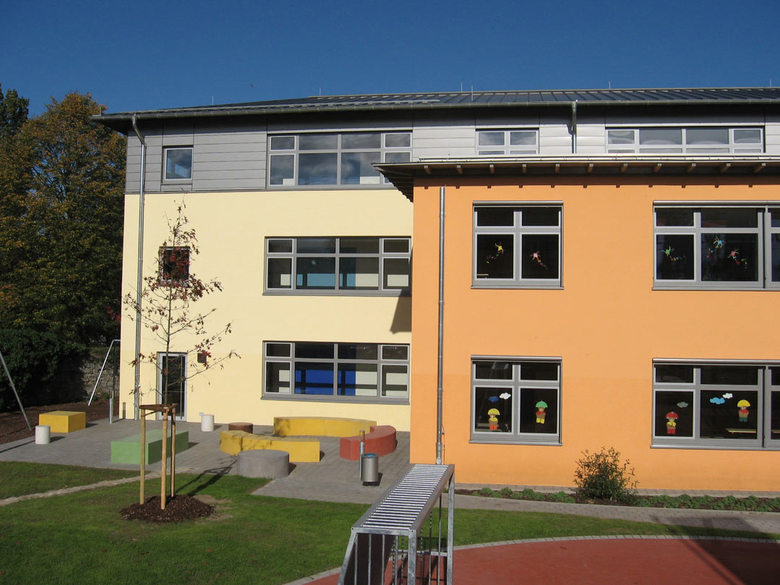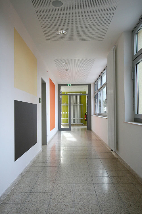 Der 3-geschossige, winkelförmige Schulneubau mit vorgelagerten 2-geschossigen Verwaltungsräumen ermöglicht der Schule in hellen, freundlichen Räumen mit moderner Technik unterrichten zu können. Dem Defizit der akustischen Wahrnehmung der Schüler werden durch eine Farbgestaltung nach Feng Shui im Innern und durch die Symbolkraft der Außenanlagen wie Hörschnecke mit Gong, Hörnerv und schiffaritges Klettergerüst neue Reize entgegengesetzt.