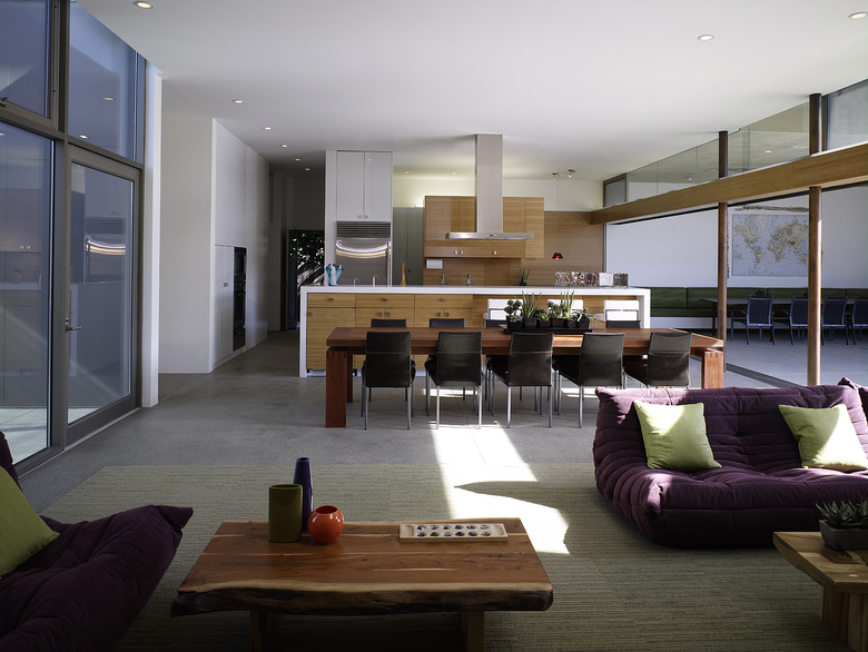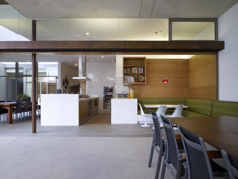 The kitchen is the heart of the house, with an open working area that allows the owner, an accomplished chef, to converse with friends while cooking. Bedrooms are intentionally designed to be very small and simple; allowing for larger public spaces, emphasizing the family over individual domains. The breakfast room looks across an outdoor courtyard to the guest room/kids playroom, establishing a visual connection while defining the separation of uses. The children can play outdoors while under adult supervision from the dining area or the office, or do homework in the office while adults occupy the adjacent outdoor or indoor space.