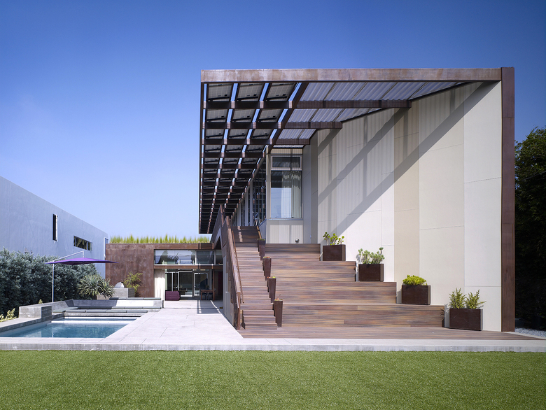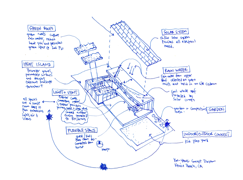 The Yin-Yang House is a net-zero energy single-family home in a quiet Venice, CA neighborhood. The design objective was to create a space for a large and growing family with several children, which would create a calm, relaxed and organized environment that emphasizes public family space. The home also serves as a place to entertain, and a welcoming space for teenagers as they seek social space with friends.