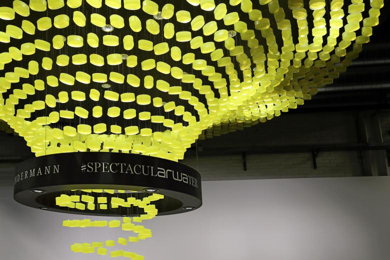 The installation is the result of close collaboration with partner 3dimensional and is representative of the philo- sophy of Bureau Hindermann. "#spectacularwater" was displayed as a teaser in the "Raumwelten" section of Swissbau 2018.