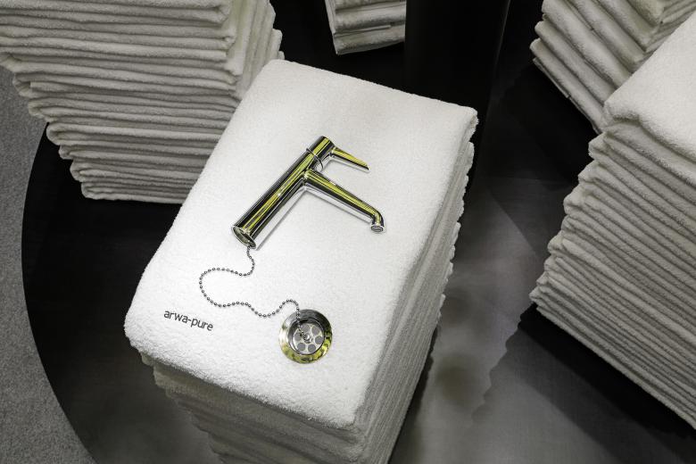 Follow the shimmering vortex from top to bottom and the arwa faucets come into view, which – reminiscent of jewellery displayed on silk cushions – are presented on podiums of soft bath towels.
