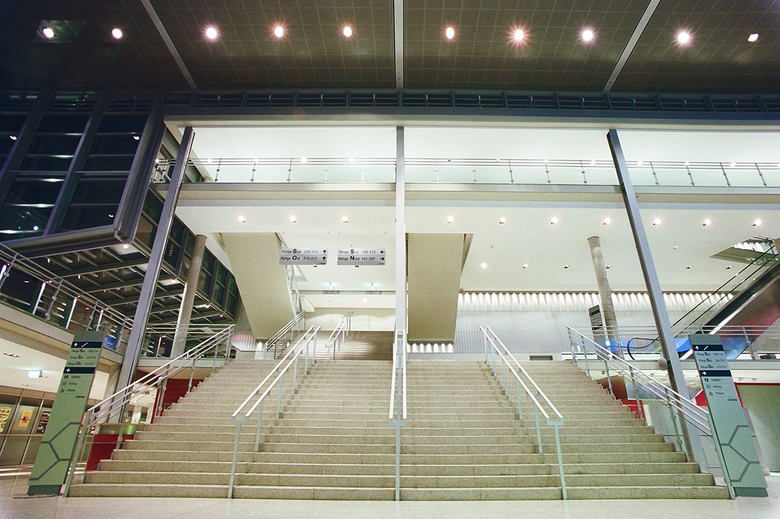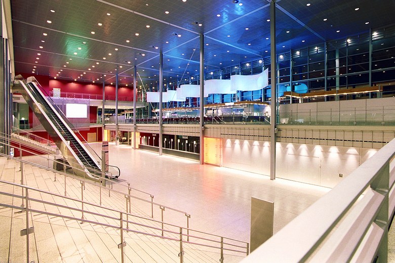 Von den beiden Haupttreppen aus wird der Blick des Betrachters auf einen Screen gelenkt, der die dahinterliegenden Technikzentralen ordnend überdeckt. Neben der Integration einer Rückprojektionsfläche macht dessen semitransparente Oberfläche die sich hinter dem Screen bewegenden Menschenströme sichtbar. Die Lust am voyeuristischen Erleben der Besuchermassen wurde hier zum Thema gemacht.
