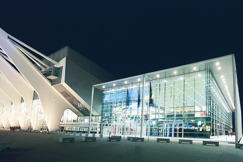 Ein riesiger leuchtender Zylinder fasst den Raum oberhalb der gastronomischen Einheit im Süden des Foyers, wodurch - im Hinblick auf die Fernwirkung - die Achse des Hauptzuganges zusätzlich betont wird. Die bewusst zurückhaltende Verwendung von Materialien begünstigt eine veranstaltungsbezogene Inszenierung durch Akzentuierungen von Lichteffekten wie etwa die farbige Hinterleuchtung der Container-Stirnflächen oder durch Projektionen auf Lichtband und Screen.