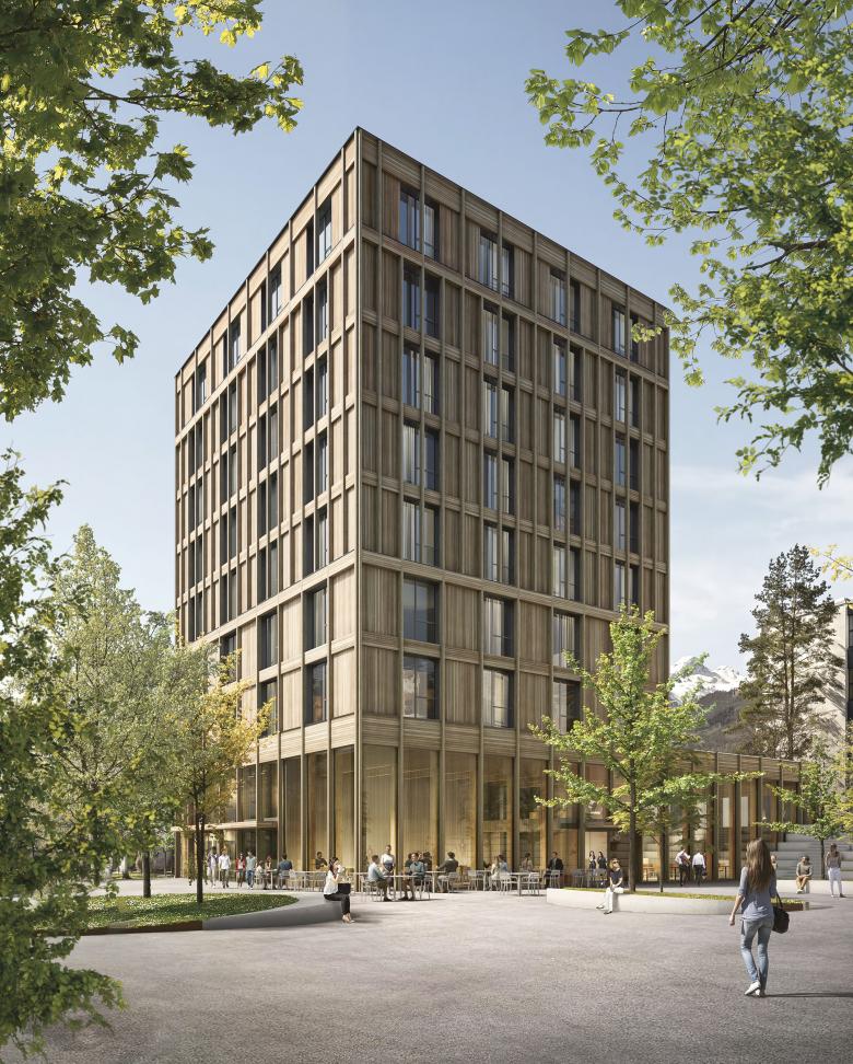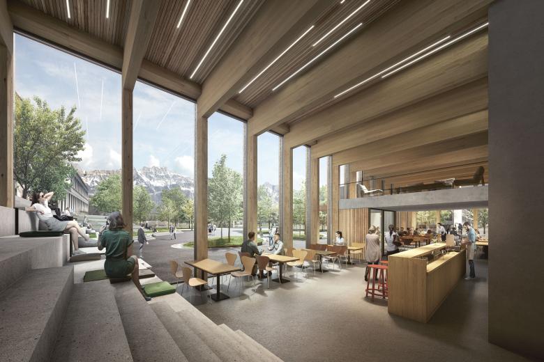 Central identification – The new facility supplements the existing school and university building to form a campus with a central square. In addition to student accommodation and rooms for lecturers and guests, the building also houses the public restaurant and café. A new gathering area is being created here for the Fachhochschule Ost, the Buchs Sargans vocational and further training school and the Zentrum Präzisionsindustrie Alpenrheintal.