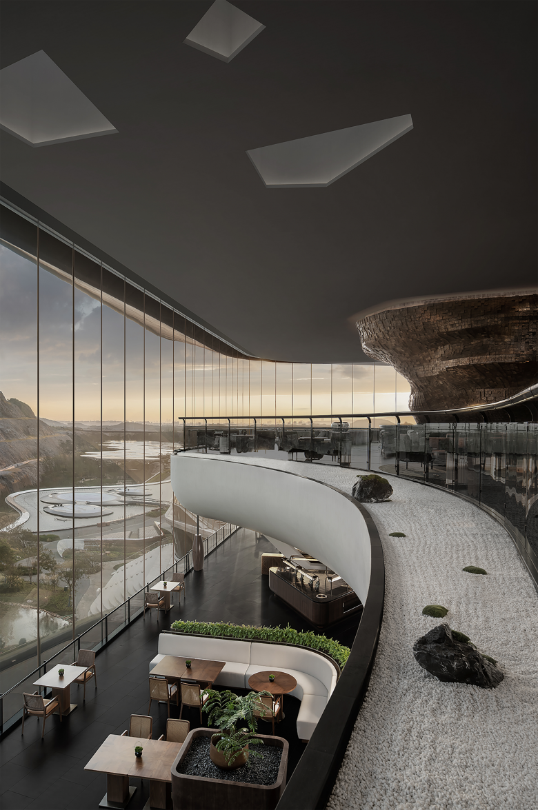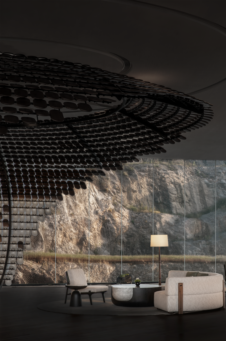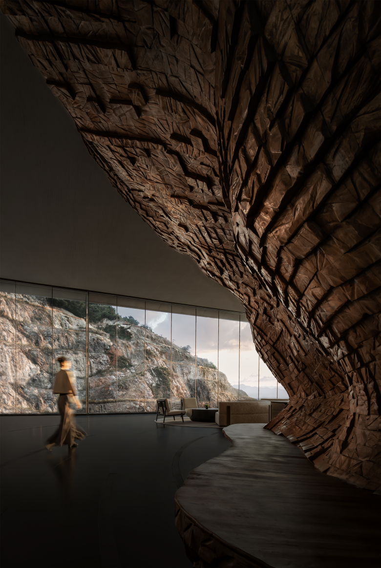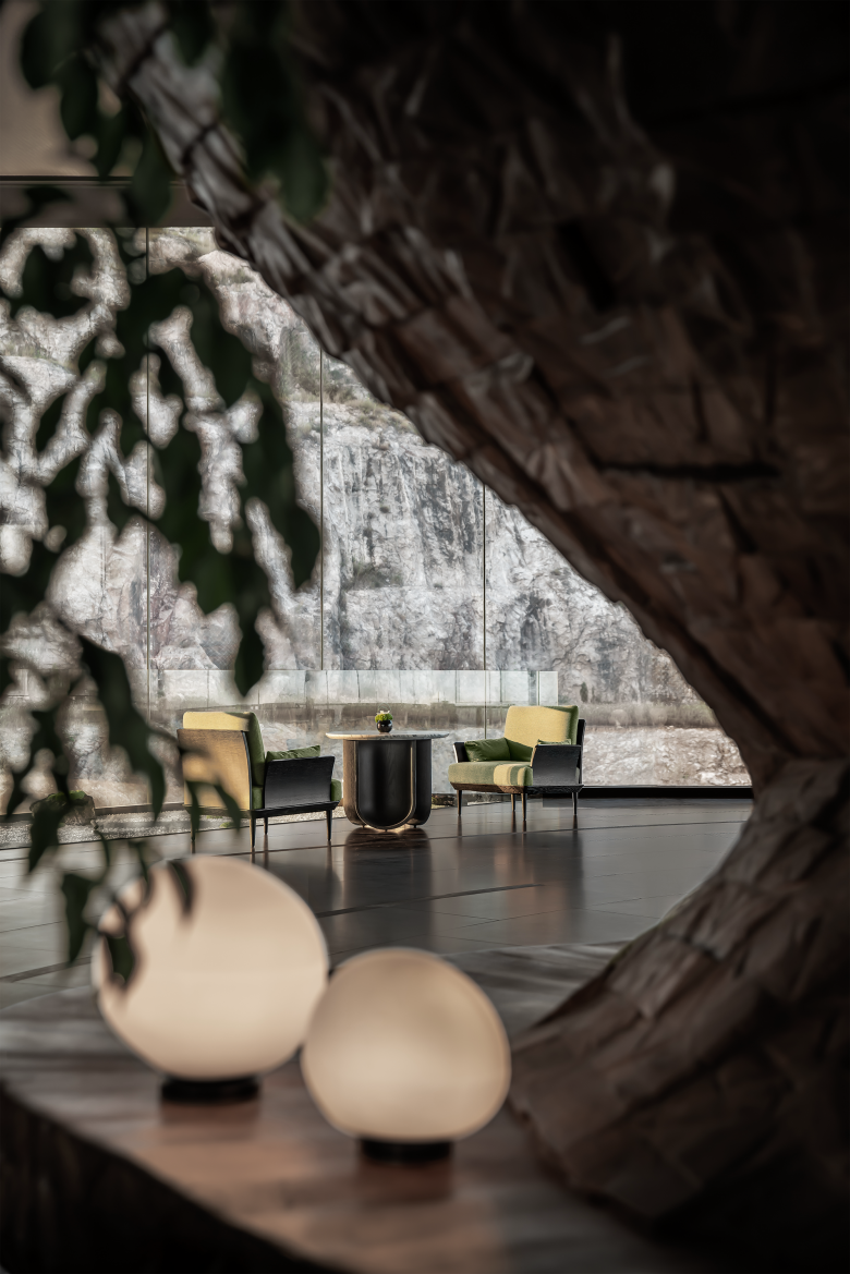 The designers brought the natural rocks of Tangshan Mountain into the interior. The rocks, eroded by winds and rain, show the traces of nature and enable the interior space to fully blend with nature.