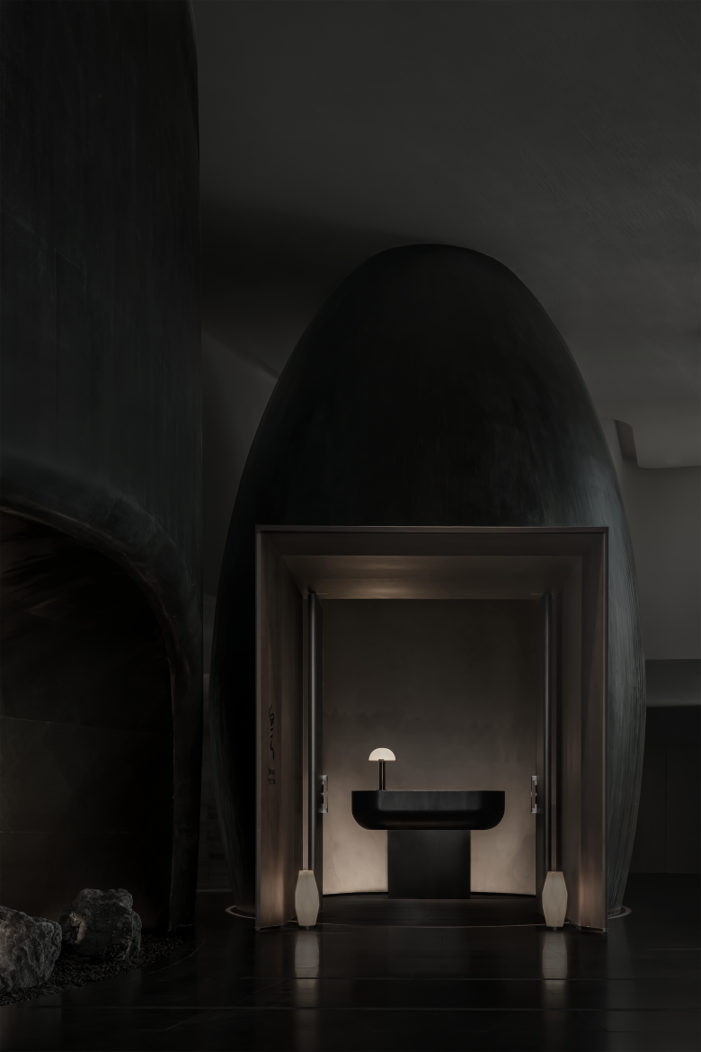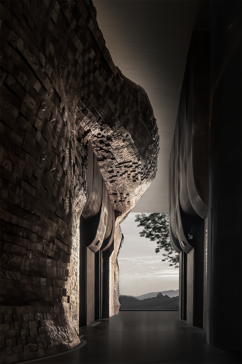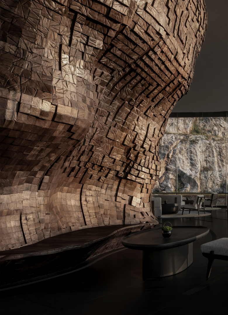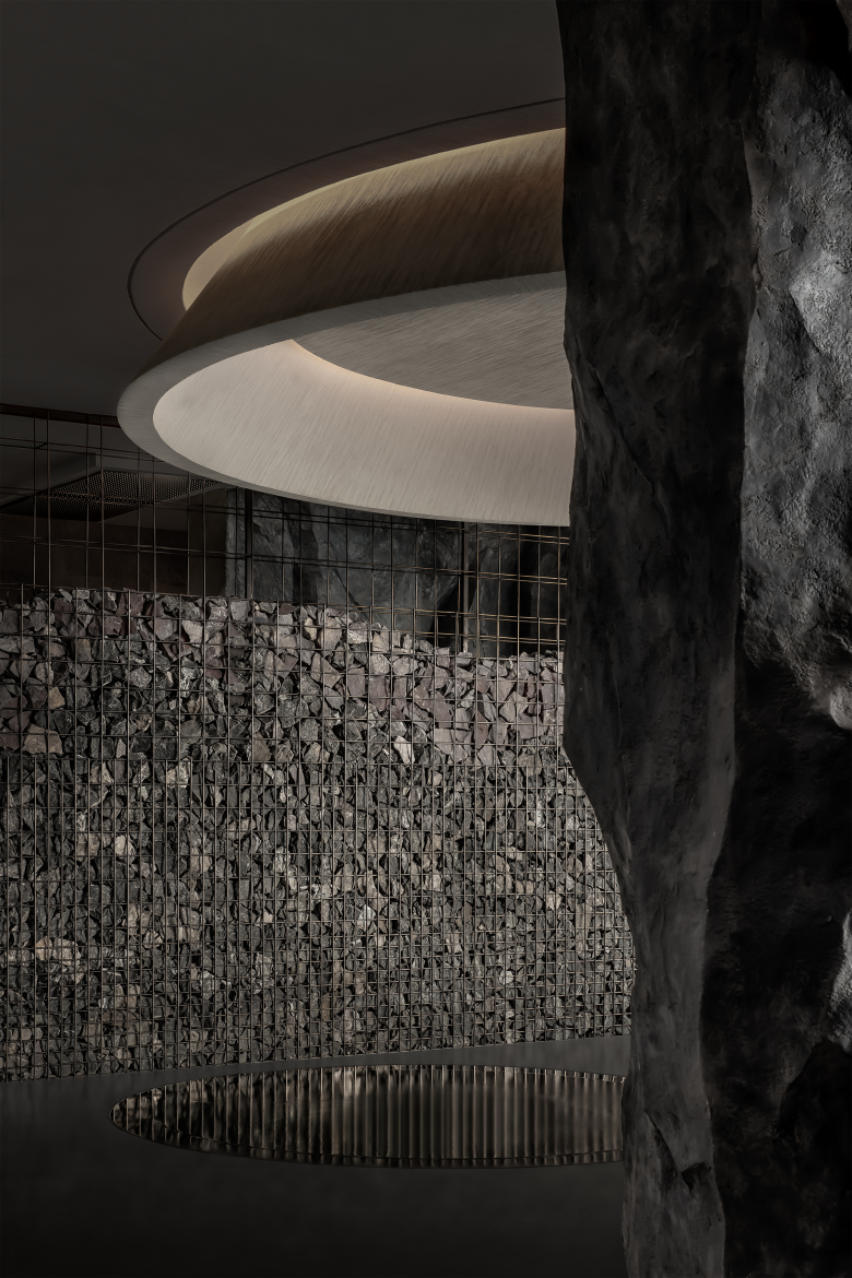 The designers brought the natural rocks of Tangshan Mountain into the interior. The rocks, eroded by winds and rain, show the traces of nature and enable the interior space to fully blend with nature.