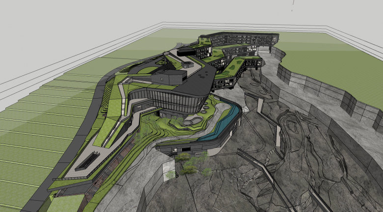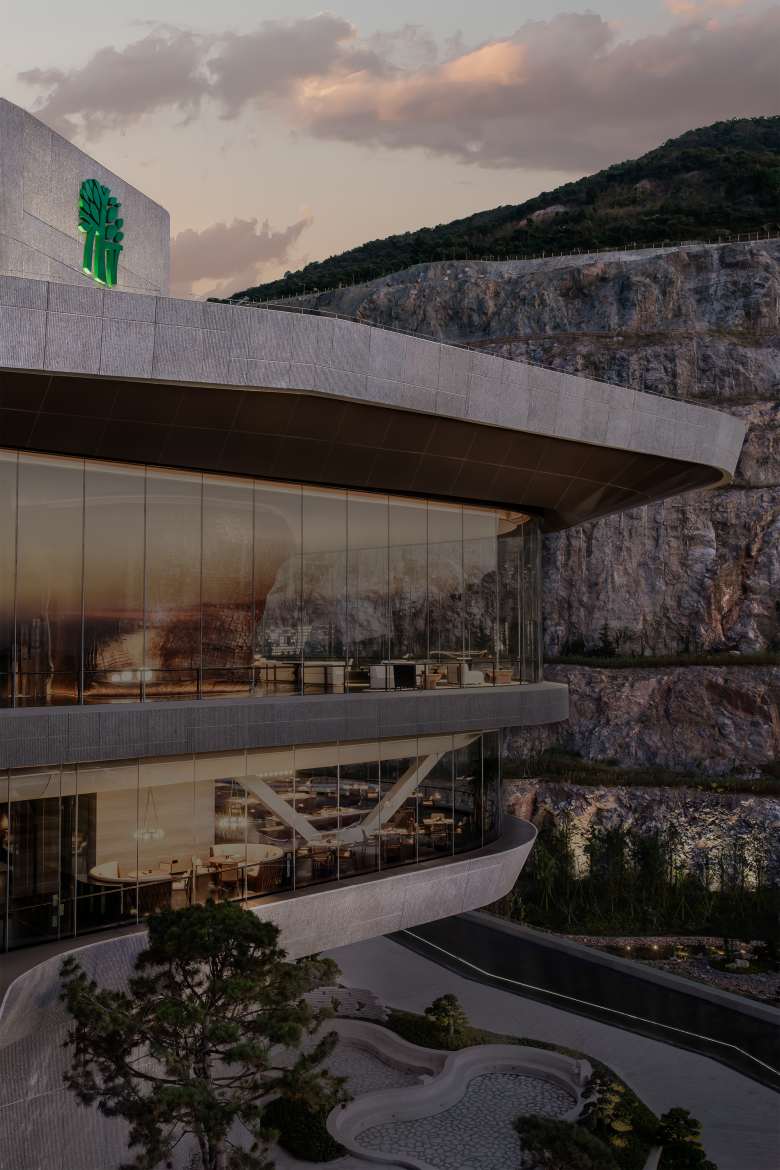 Through the years, plants have quietly grown between the rock layers, and formed a beautiful texture on the stone cliff in the quarry. The entire quarry cliff looks like a natural landscape painting, which inspired the design team.