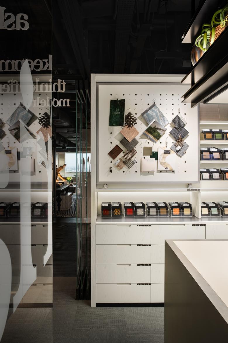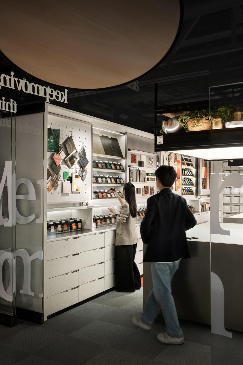 The material hall serves as a curated showcase of global creative products, highlighting CCD’s dedication to leading-edge technology, sustainability, and the development of an integrated online-offline platform that enhances connectivity, collaboration, and innovation. This space exemplifies our commitment to sustainability by artfully integrating recycled materials and adornments from past projects into its design narrative.