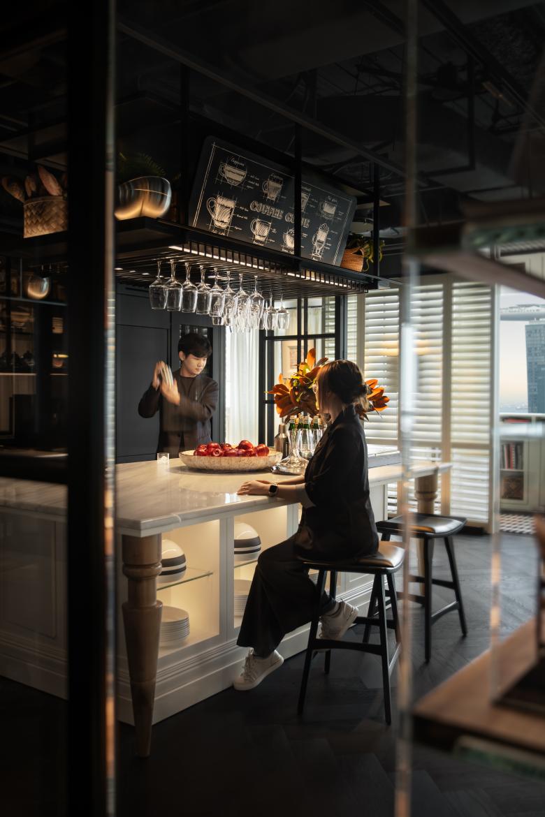 The open kitchen island, ideal for casual bar drinks, light meals, or lively discussions, showcases the space’s versatility and openness. Subtle yet refined design elements--like the premium emerald jade countertop and the smart Kaelo wine cooler--highlight the ingenuity behind each detail.