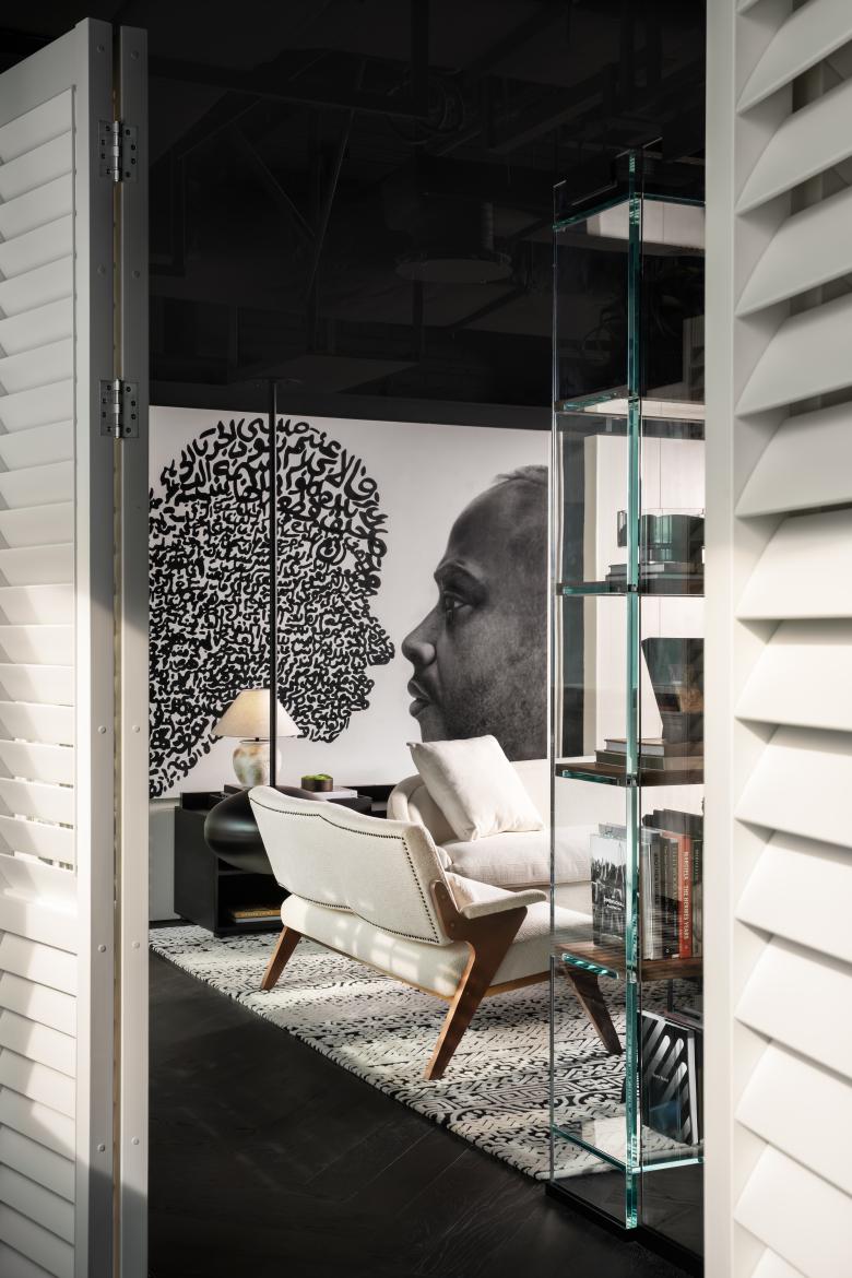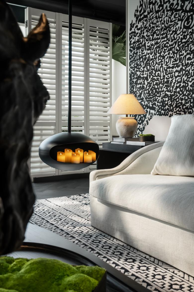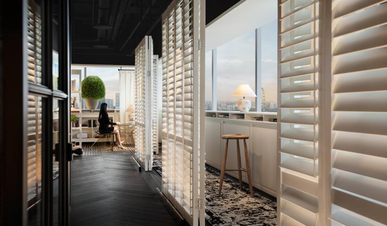Strolling through the space feels like wandering through a garden, where every door, window, and screen carve out distinct, meticulously crafted realms, each with its own elegance.