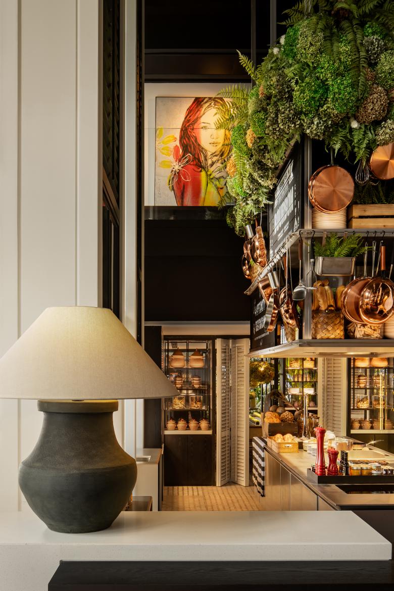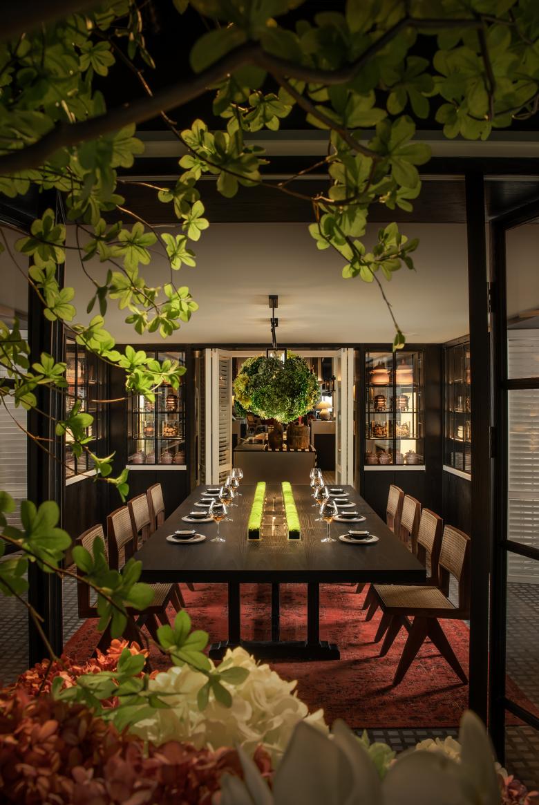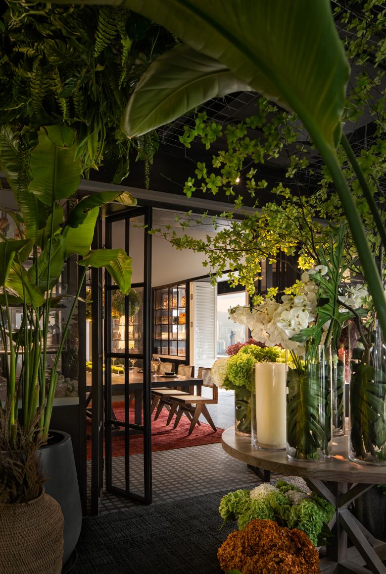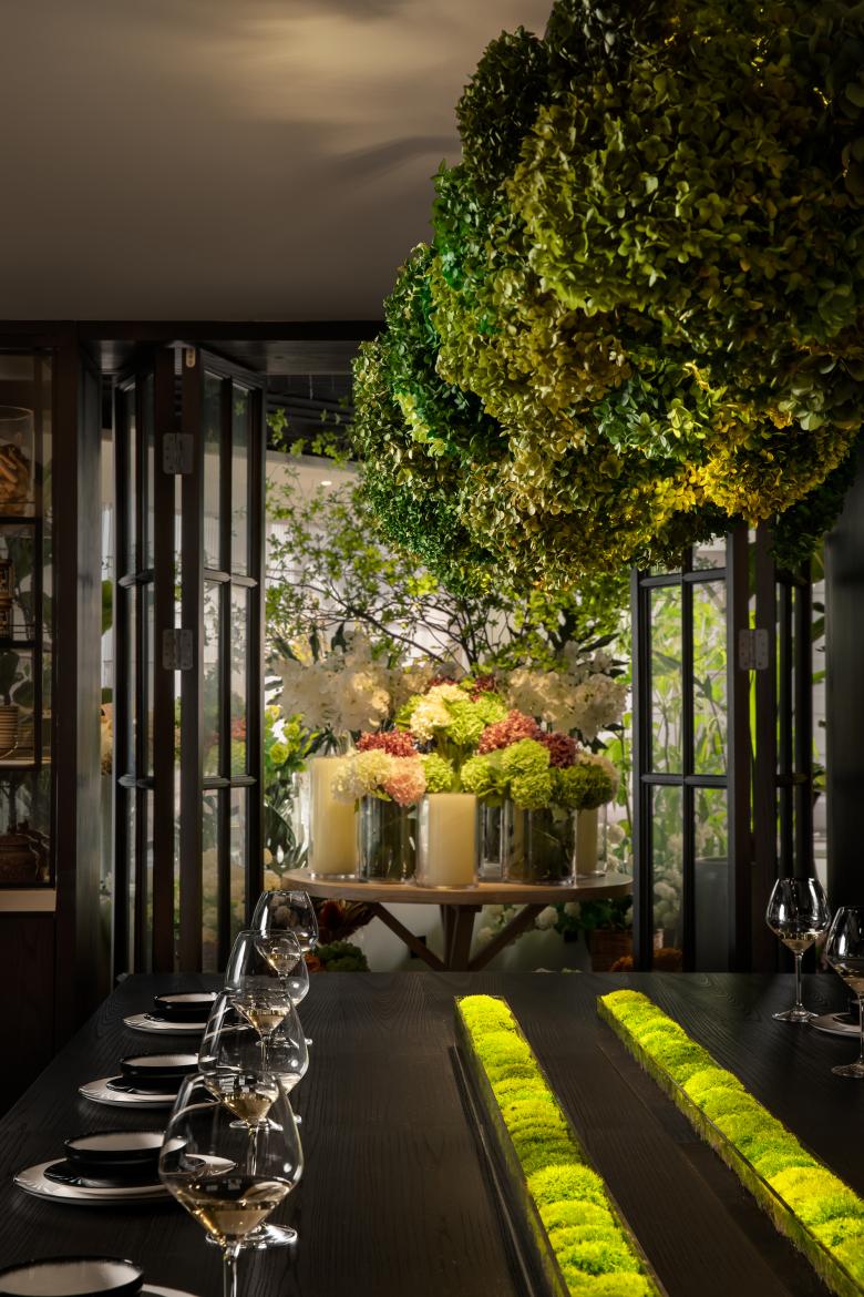 The floral art and greenery are strikingly red and lush, adding a touch of brightness to the elegant space. It enriches the space while creating a unique life force.