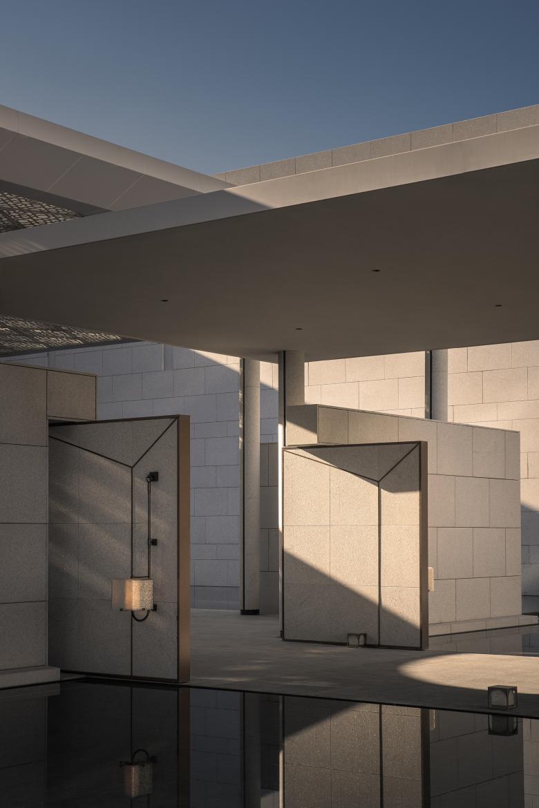 Beyond the city’s clamor, guests are welcomed into a tranquil retreat, where a manor-style garden sets the prelude to a ceremonial journey of discovery. Inspired by traditional courtyard dwellings in the Ili River Valley, the entrance unfolds as a tri-winged architectural cluster. Four distinct courtyards compose a rhythmic spatial sequence that flows from openness to intimacy, gently guiding guests through a subtle transition of mood. Local elements are reimagined through contemporary materials and craftsmanship—with the iconic blue palette of Yining houses and the intricate Kazakh wood carvings translated into refined architectural touches, most notably in the porch details. Shimmering water animates the buildings, leading travelers into a sanctuary of serene elegance.