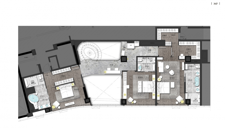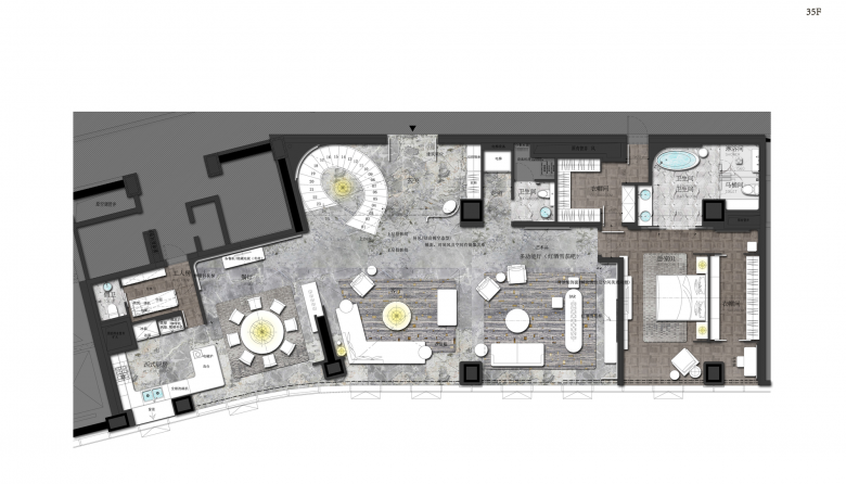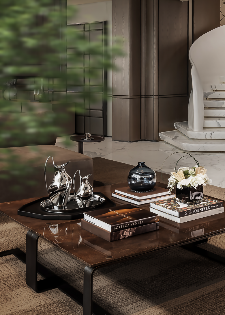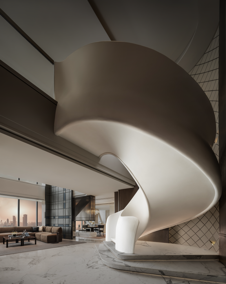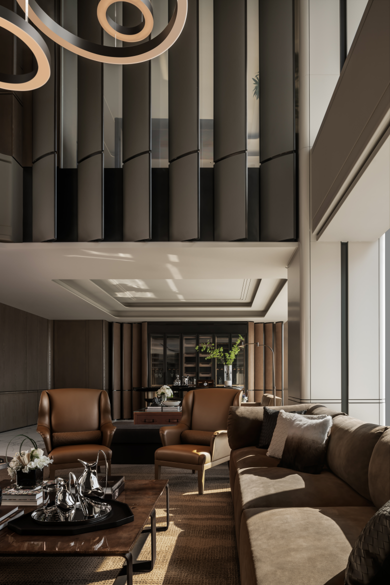 The entrance foyer is a double-height space, creating a magnificent atmosphere and conveying the pursuit of quality life. The spiral staircase not only connects the upper and lower levels, but also acts as an art installation, with its graceful curves adding dynamic rhythms to the space.