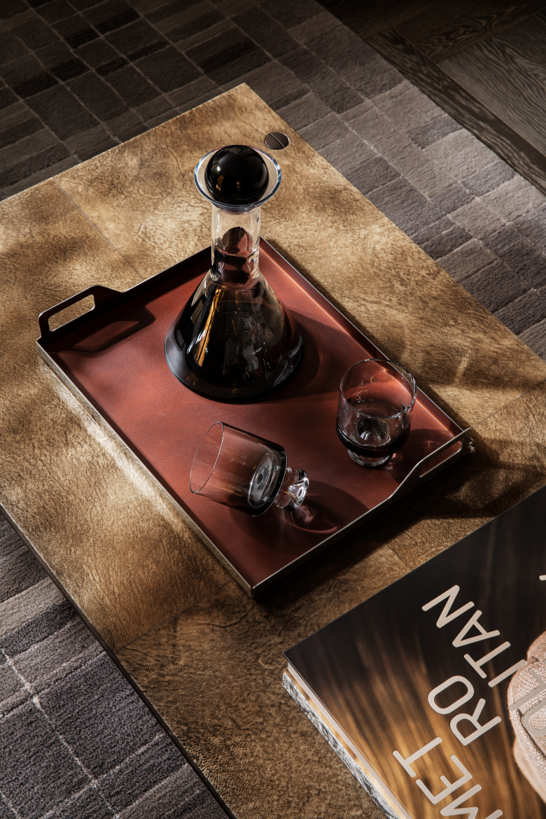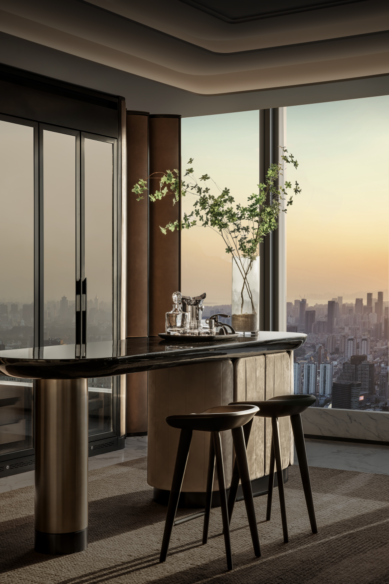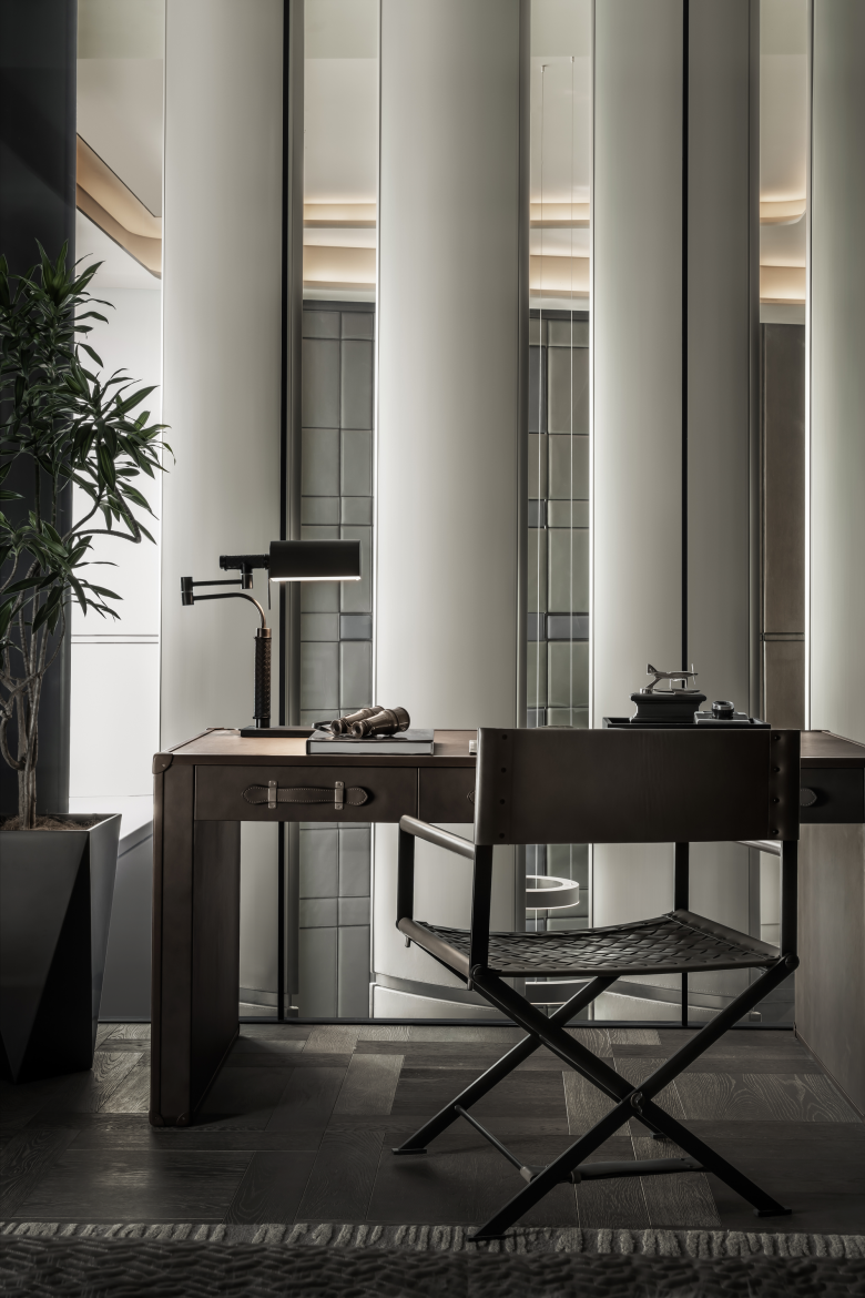 Wine cabinet, fireplace, soft carpet, fine leather, and Bottega Veneta's classic intertwined elements, endow the home with exquisite and luxury detailing.