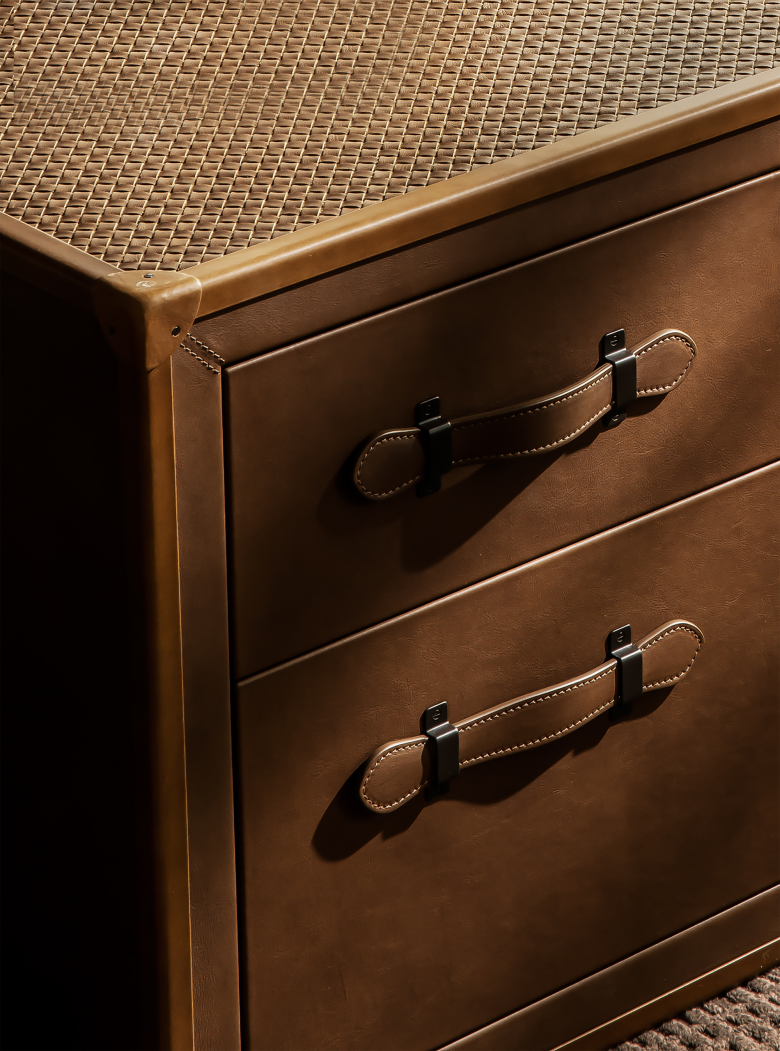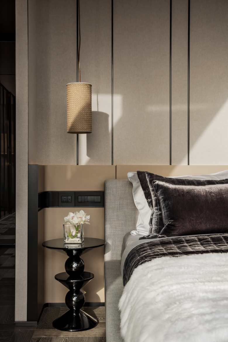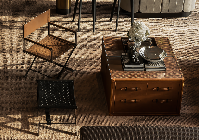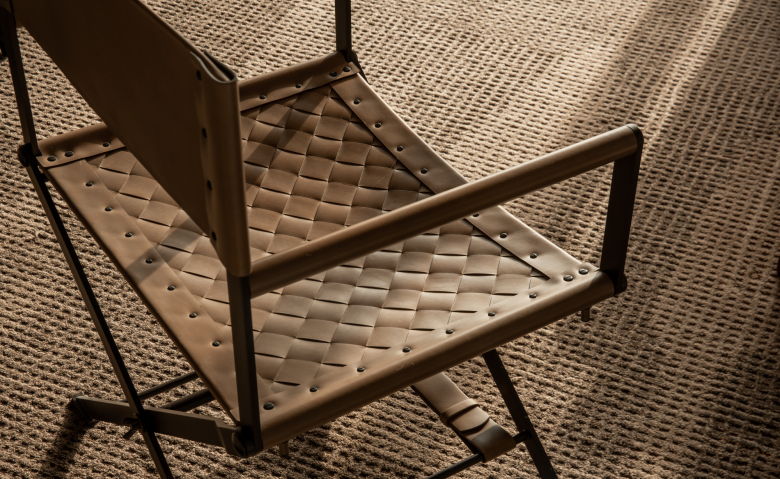 The soft, delicate leather is a pure expression that represents Bottega Veneta. The woven leather chair shows simple, soft textures and a modern artistic touch. To unify the visual effects, interior lighting fixtures are designed with lampshades that refer to Bottega Veneta's iconic interwoven pattern. Sunlight filtered into the space along with tactile articles creates a cozy atmosphere. Bedrooms are respectively interpreted by geometric forms, earth tones, and woven leathers, conveying feminine elegance and male gentleness. The tactile fabrics of Bottega Veneta furniture pieces add to the exquisiteness of the space.