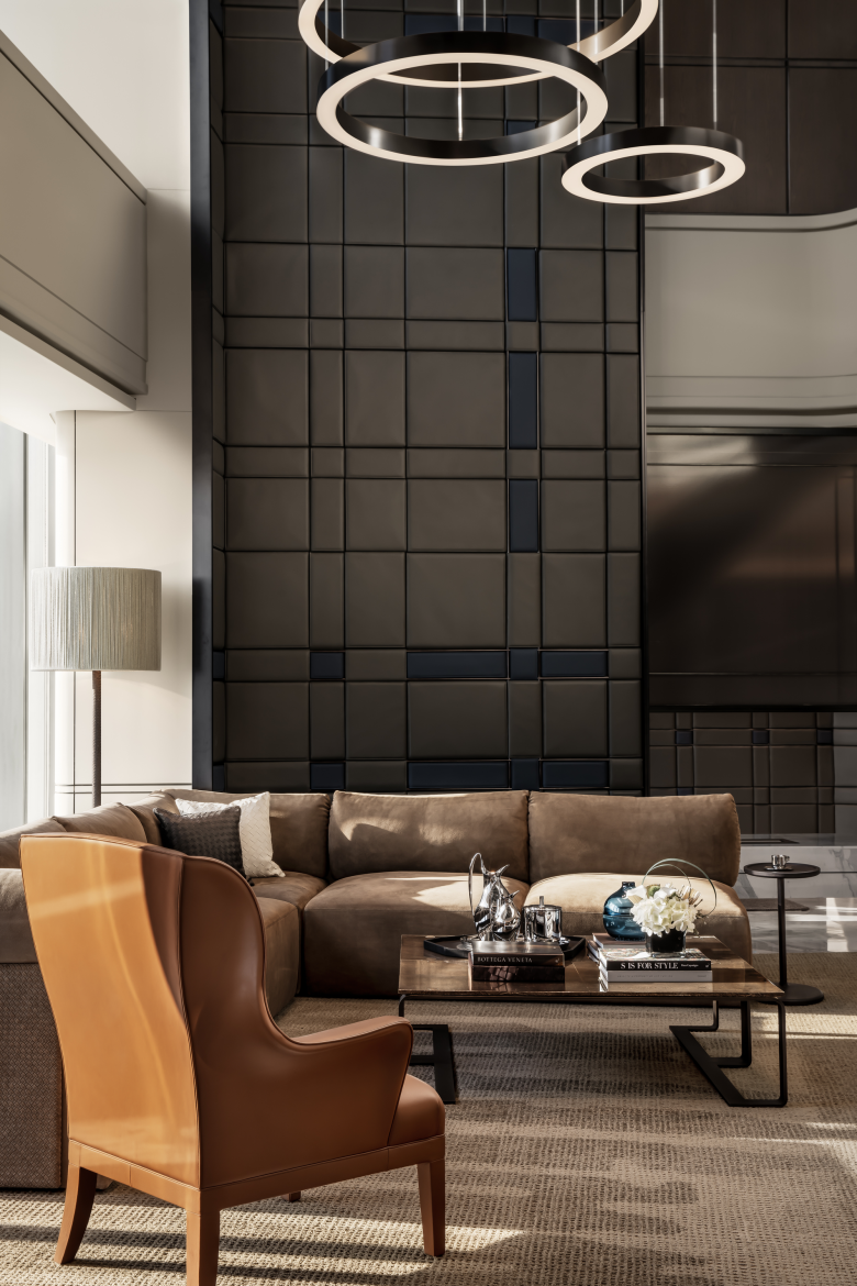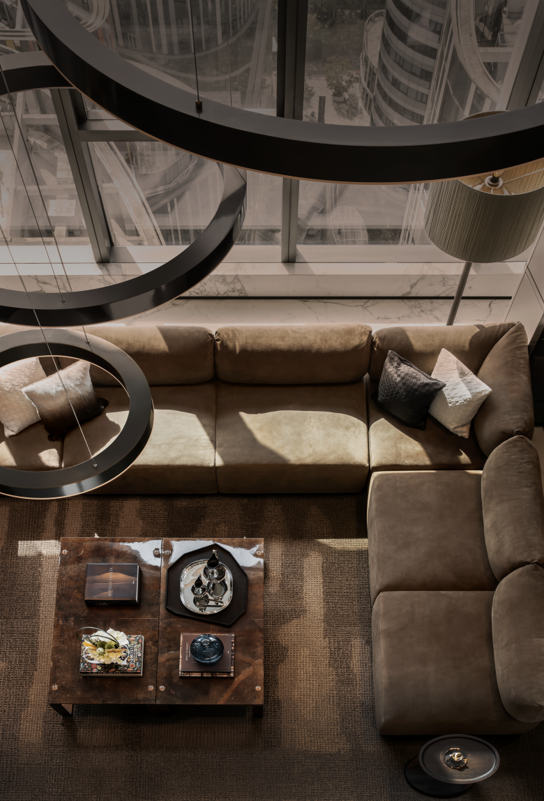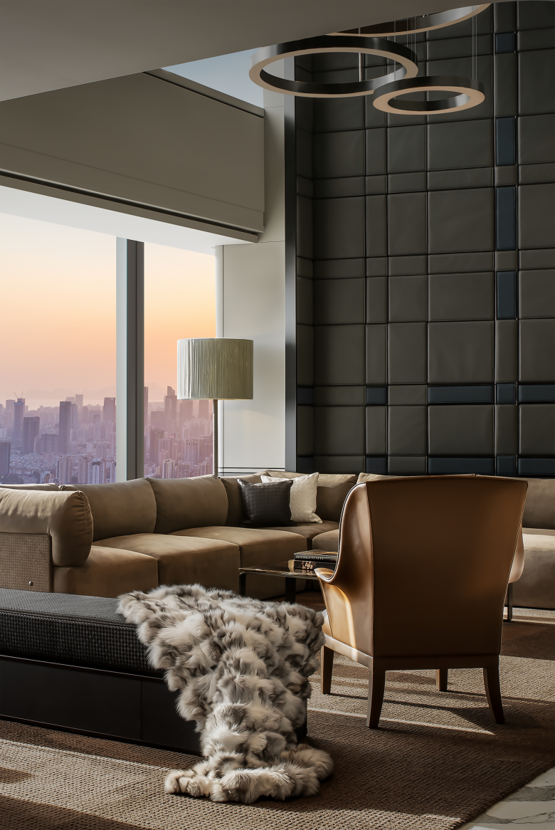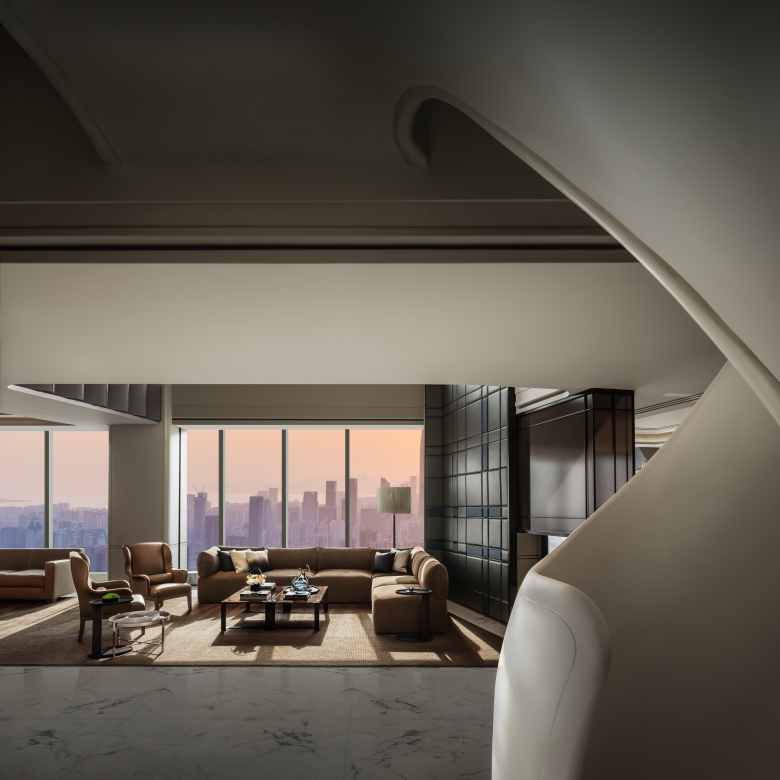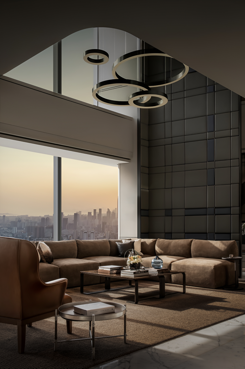 The large living room is dominated by neutral tones. The suitable mix and match of colors, the superior artworks and furnishings, and the exquisite Italian-style craft, all embody the unique low-key elegant style and modern luxury taste of Bottega Veneta.