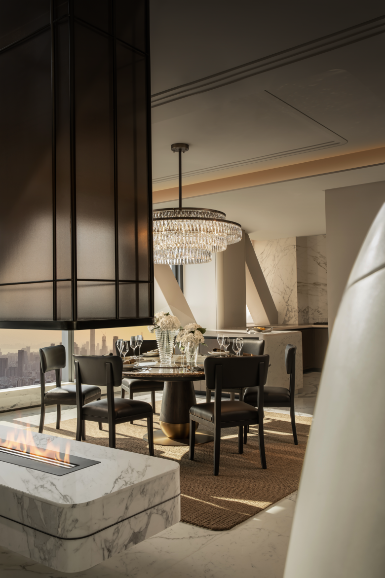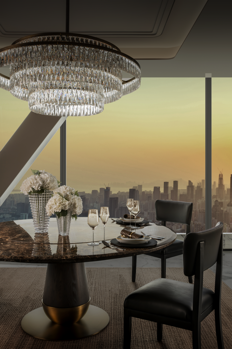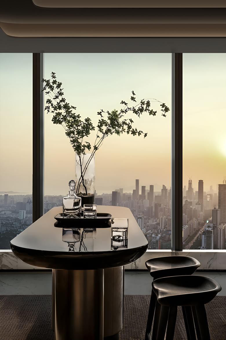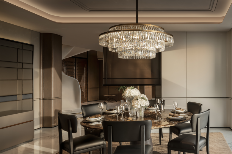 The super large living & dining area is open, with French windows providing a 270°view to the outdoors and blurring the boundary between interior and outside. The dining room's design continues Bottega Veneta's multi-dimensional imagination and artistic aesthetics expressed at the living room. Marble dining table and black chairs are combined with exquisite utensils, producing a simple and elegant visual effect.