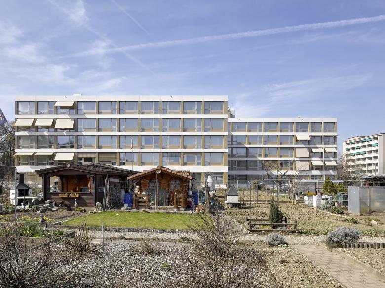 Mit den Alterswohnhäusern bildet der Gebäudekörper von der Öffentlichkeit geschützte Grünräume. Sie sind vom Erdgeschoss gut erschlossen und werden als Gartenfläche für alle Bewohner nutzbar.