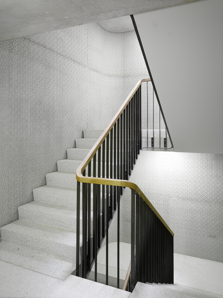 Bei beiden Häusern werden über ein innenliegendes Treppenhaus vier Wohnungen pro Geschoss erschlossen, die alle von zwei