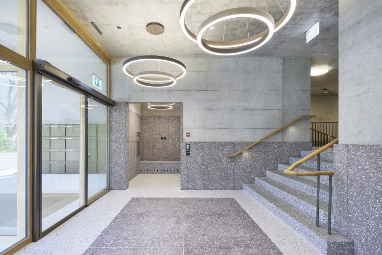 Das hohe Haus definiert in der Gesamtanlage mit dem gleichhohen Residenzneubau einen klaren Ankunftsort, von dem aus die Residenzwohnungen, das Altersheim und die neuen Alterswohnungen des Rigaparks erschlossen werden können.
