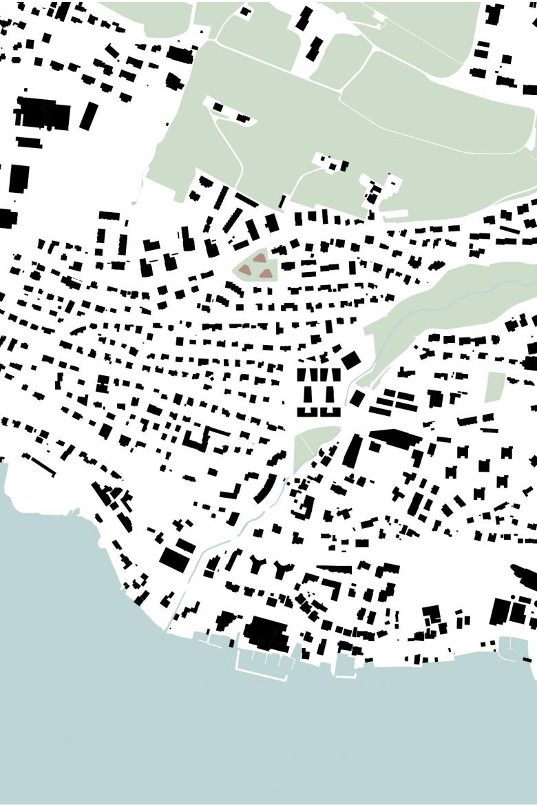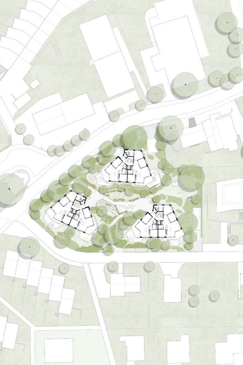 Das Grundstück für die Überbauung Neuwiesen befindet sich oberhalb von Meilen an der Pfannenstielstrasse Ecke Neuwiesenstrasse in einem durchgrünten Wohnquartier. Die polygonale Form und die Orientierung in Richtung See, Süden und Weitsicht prägen den Entwurf massgeblich. So ist die Position der Baukörper und deren Dreiecksfigur aus den Blickachsen und der Ausrichtung der Wohnbereiche gegen Süden entwickelt. Auch die Nachbarn nördlich der Parzelle profitieren von den diagonalen, grosszügigen Durchblicken. Aus dieser Anordnung der Häuser auf unterschiedlichen Ebenen entsteht eine gemeinsame, offene Mitte. Die Erschliessung der Wohnungen erfolgt aus diesem zentralen Wegsystem.
