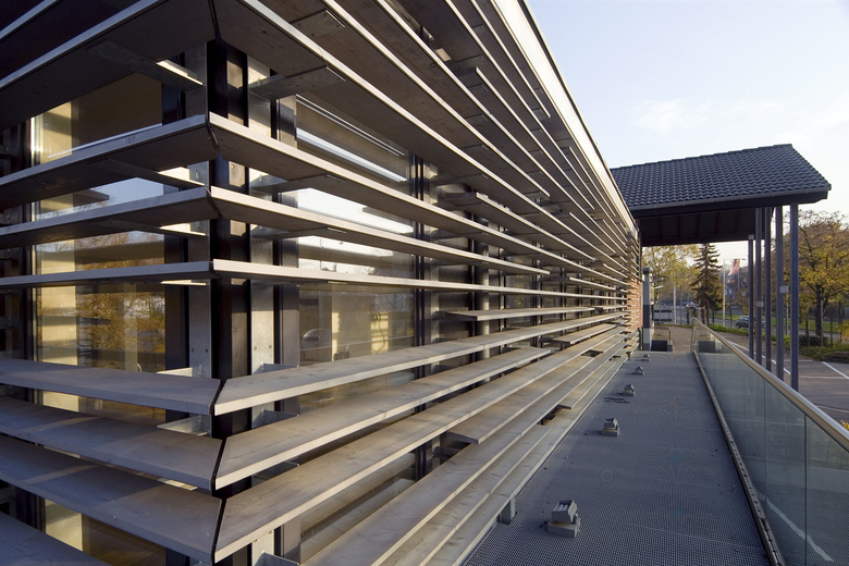 Neben dem neuen Aufbau mit der markanten Holzlamellen-Fassade, ist der Treppenturm die einzige neue bauliche Ergänzung.