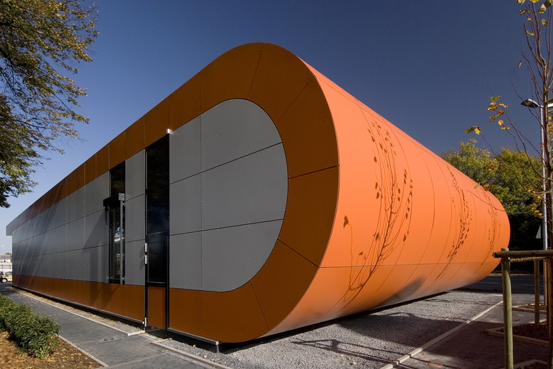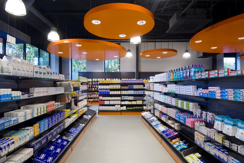 Die Gebäudeform dieser Markenarchitektur ist jedoch nicht Selbstzeck, sondern wurde sowohl von innen als auch außen nach einem typischen Apothekenprodukt entwickelt: einer orangeweißen Pille.