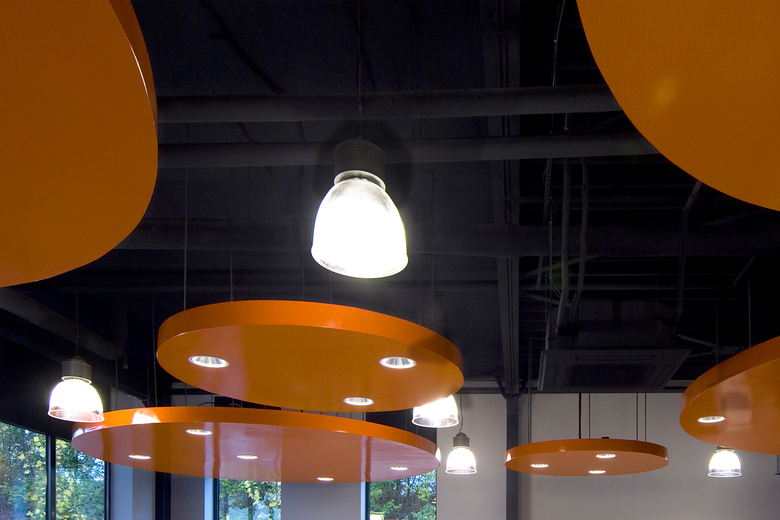 Kreisrunde Akustiksegel hängen von der Decke herab und kommunizieren die CI-Farben des Unternehmens.